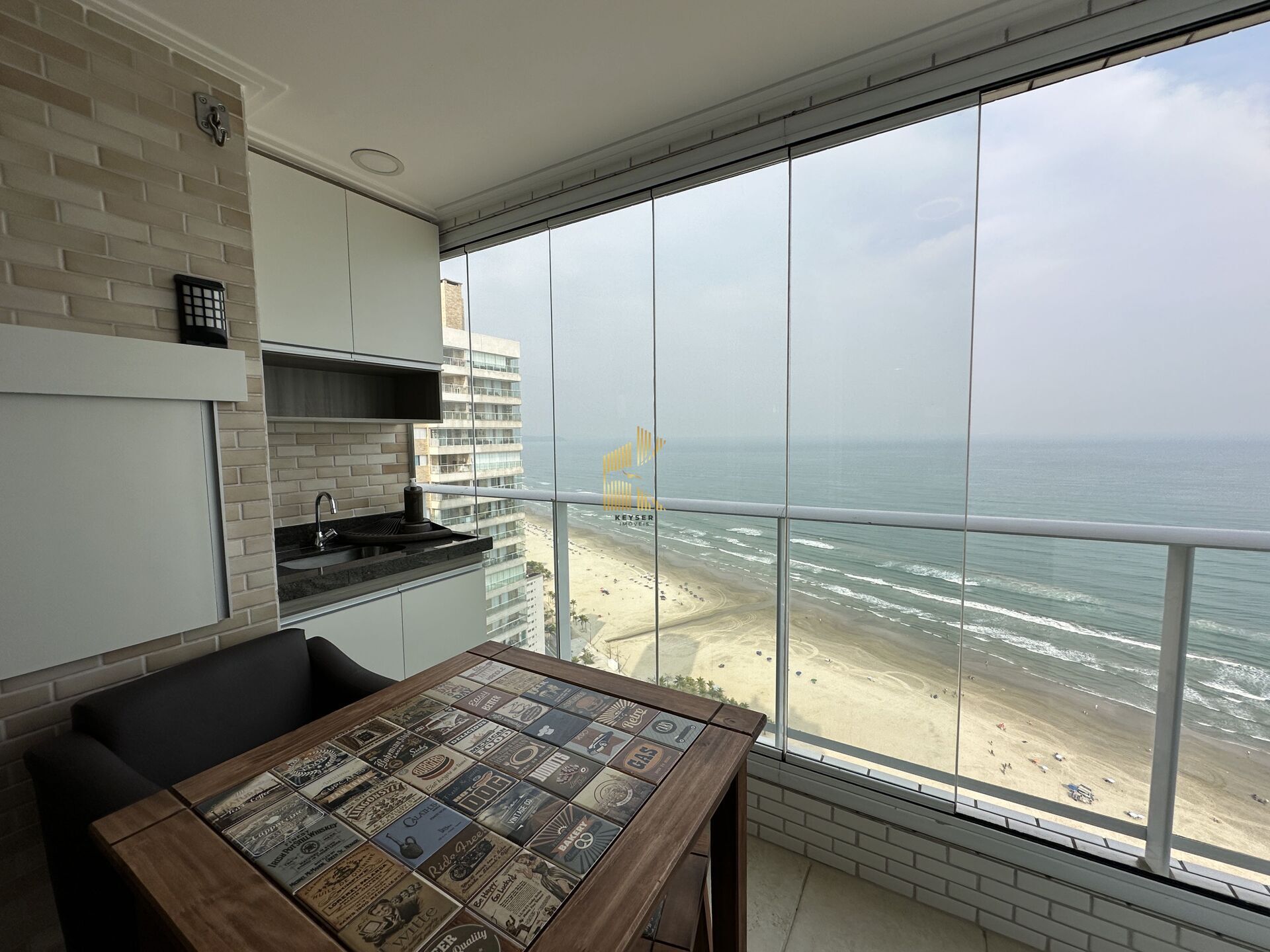 Apartamento Alto Padrão à venda no bairro Mirim em Praia Grande, SP. 2 dormitórios sendo 1 suíte, sala dois ambientes com sacada envidraçada vista mar, cozinha planejada, área de serviço, banheiro social e 1 vaga de garagem. Porteira fecha.
