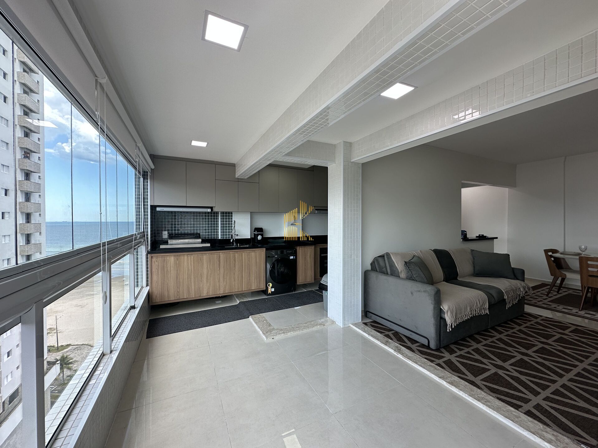 Apartamento Alto Padrão à venda no bairro Maracanã em Praia Grande, SP. 2 dormitórios sendo 1 suíte, sala dois ambientes integrada com a sacada, envidraçada vista livre para o mar e para a montanha, cozinha planejada e integrada com a sacada, área de serviço, banheiro social e 1 vaga de garagem. Porteira fechada.
