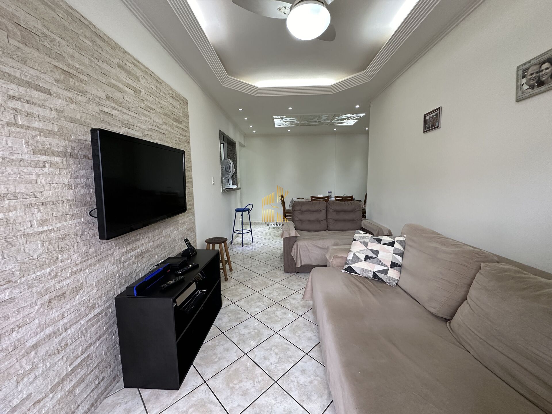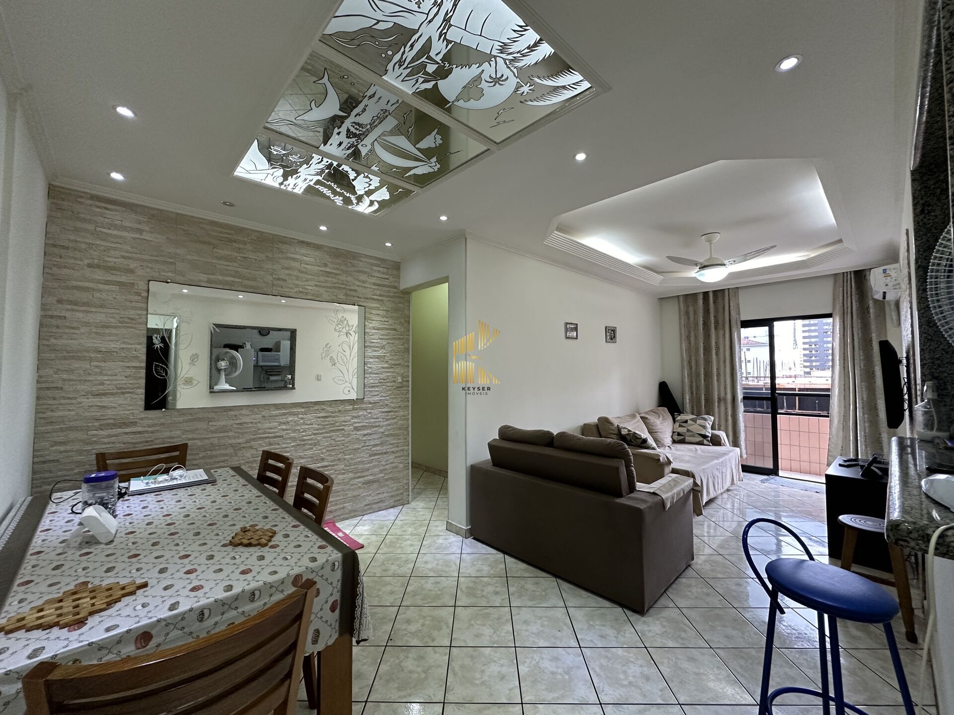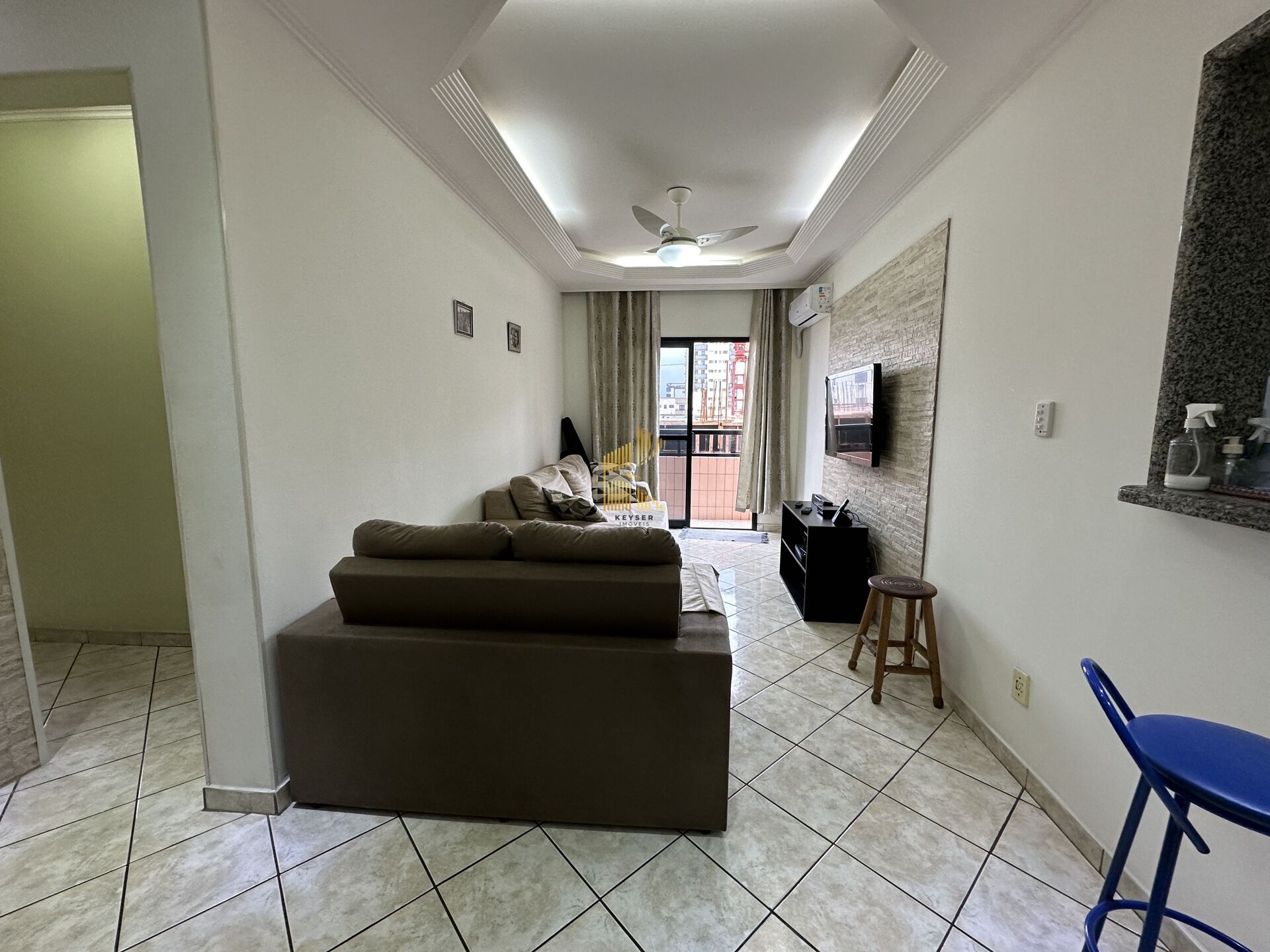 Apartamento à venda no bairro Guilhermina em Praia Grande, SP. 2 dormitórios (1 suíte), sala dois ambientes com varanda, cozinha americana, área de serviço, banheiro social e uma vaga de garagem. Será vendido semi mobiliado.