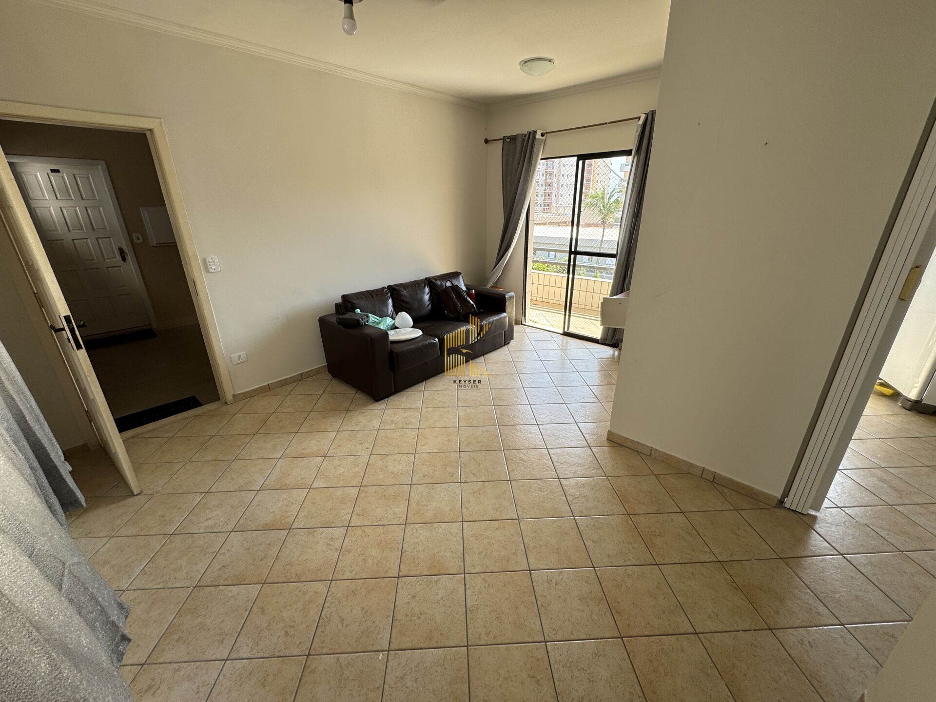 Apartamento à venda no bairro (Aviação) em Praia Grande, SP. 2 dormitórios, sala com sacada, cozinha, área de serviço, banheiro social e uma vaga de garagem.