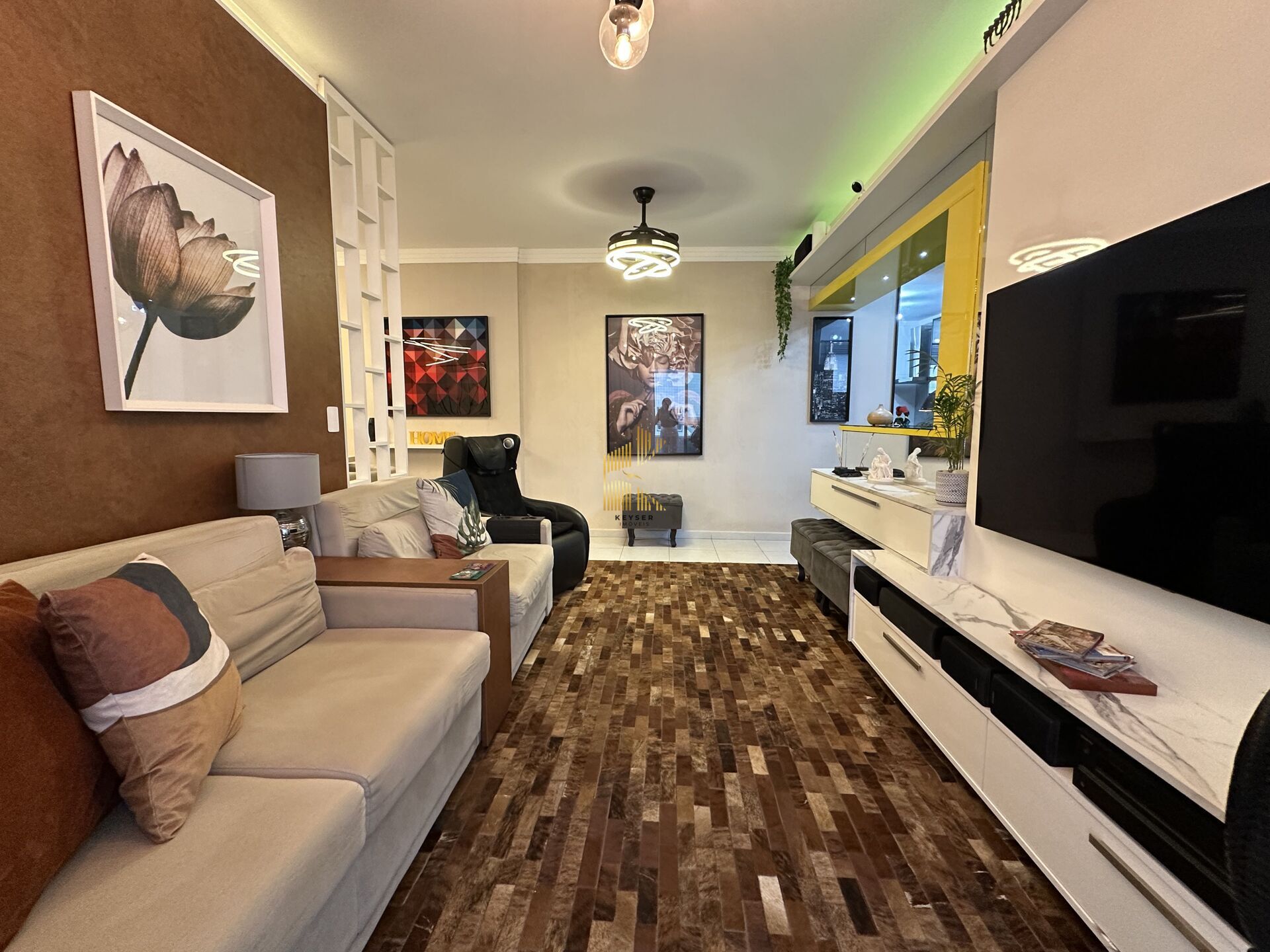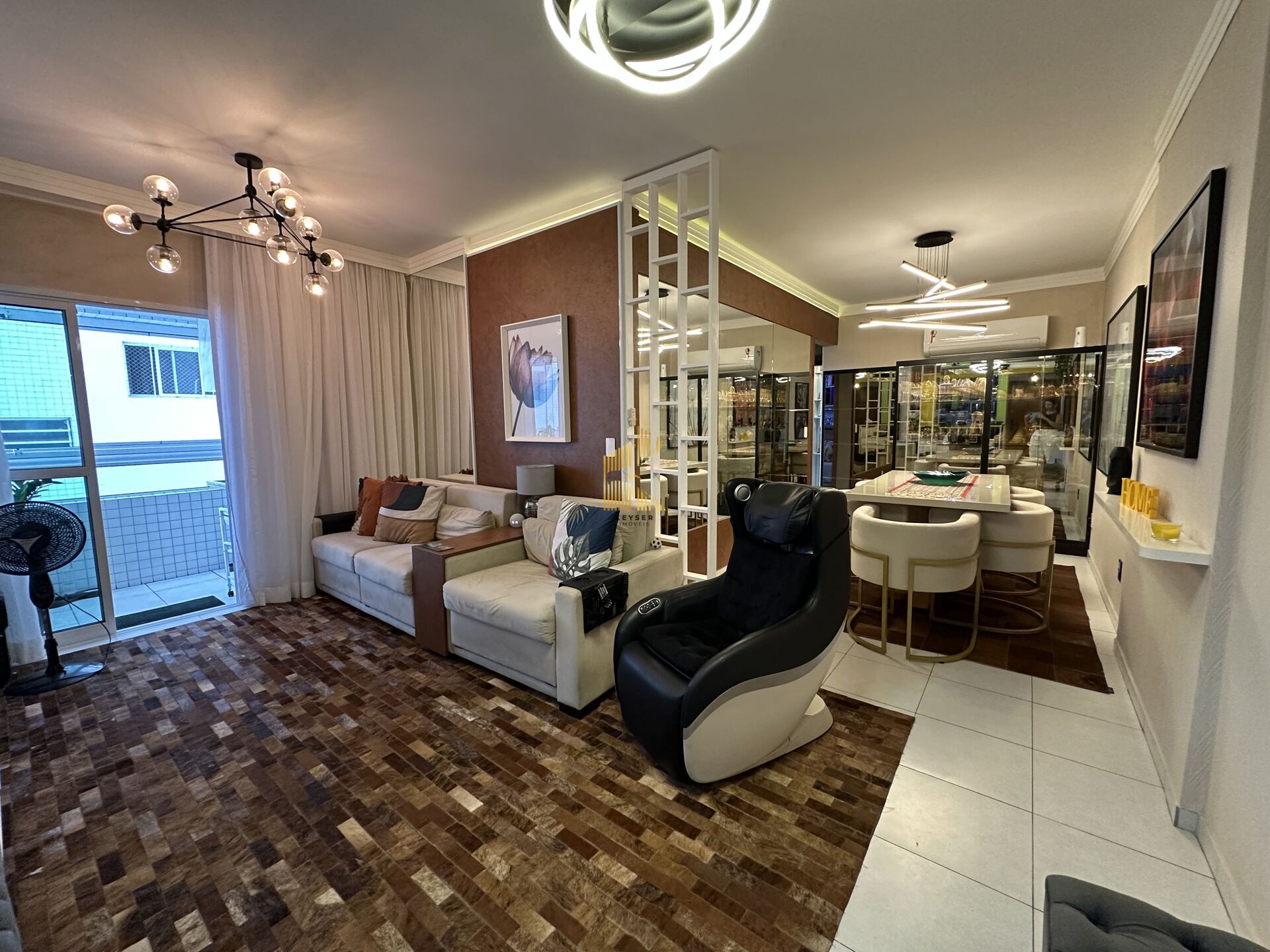 Apartamento à venda no bairro Guilhermina em Praia Grande, SP. 3 dormitórios (sendo 1 suíte), sala dois ambientes com sacada gourmet, cozinha planejada de alta qualidade, área de serviço, lavabo, banheiro social e duas vagas de garagem. Será vendido mobiliado.