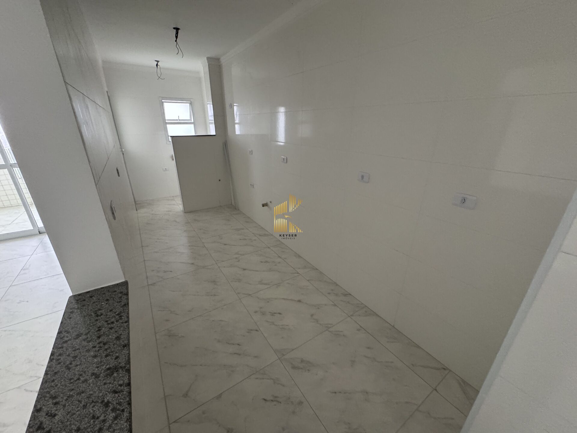 Apartamento à venda no bairro Mirim em Praia Grande, SP. 2 dormitórios (sendo 1 suíte), sala dois ambientes com sacada, cozinha, área de serviço, área técnica, banheiro social e duas vagas de garagem.