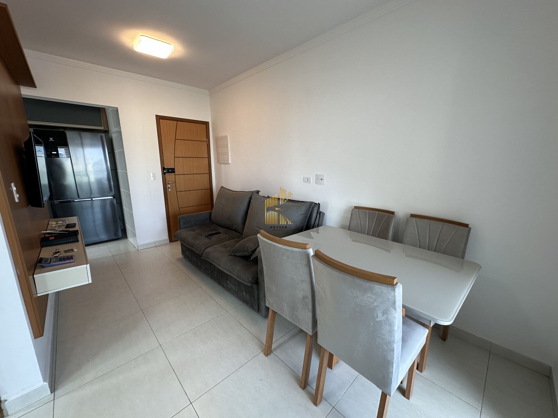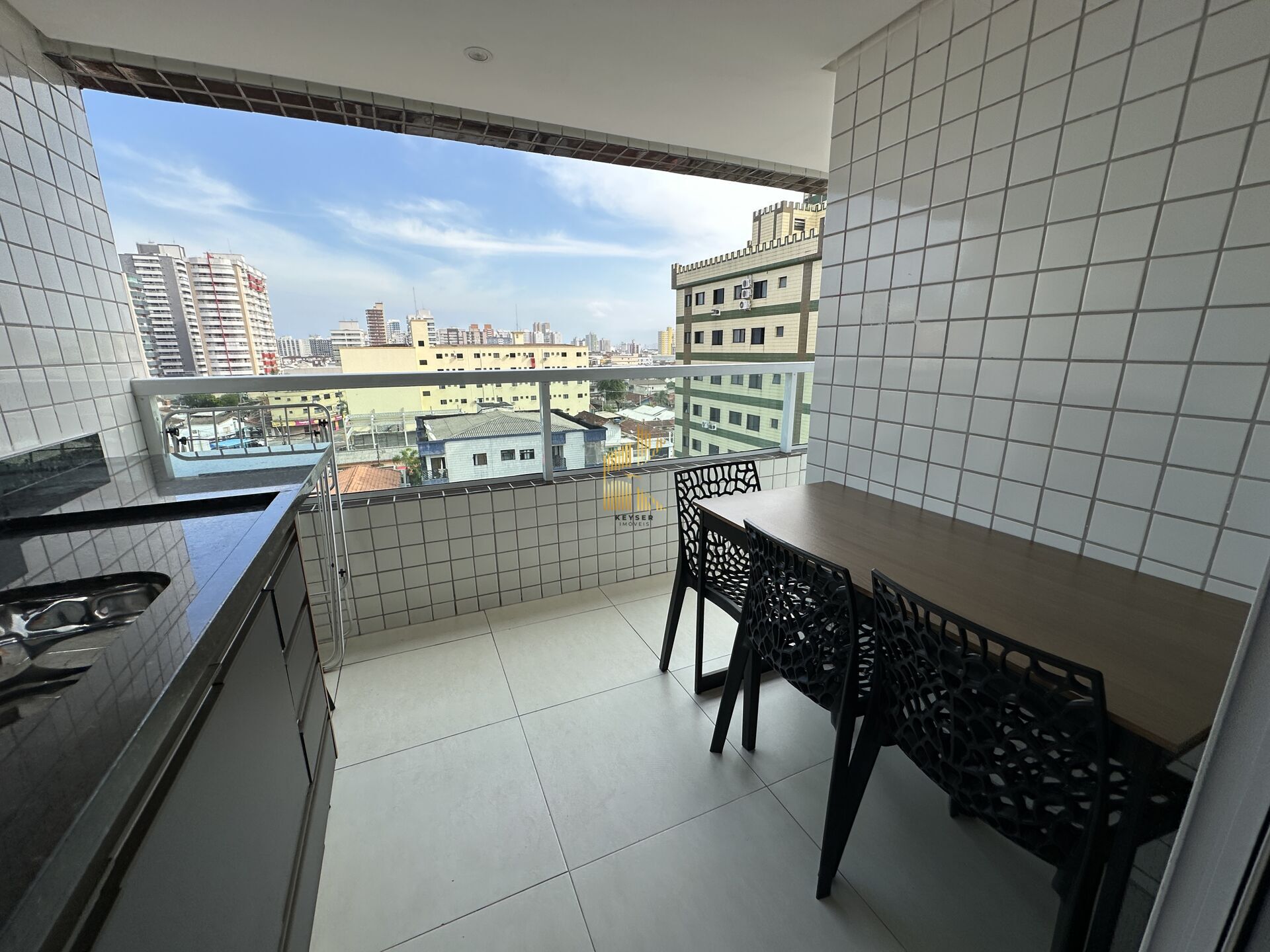 Apartamento à venda no bairro Ocian em Praia Grande, SP. 2 dormitórios sendo 1 suíte, sala dois ambientes com sacada, cozinha, área de serviço, banheiro social e uma vaga de garagem. mobiliado.