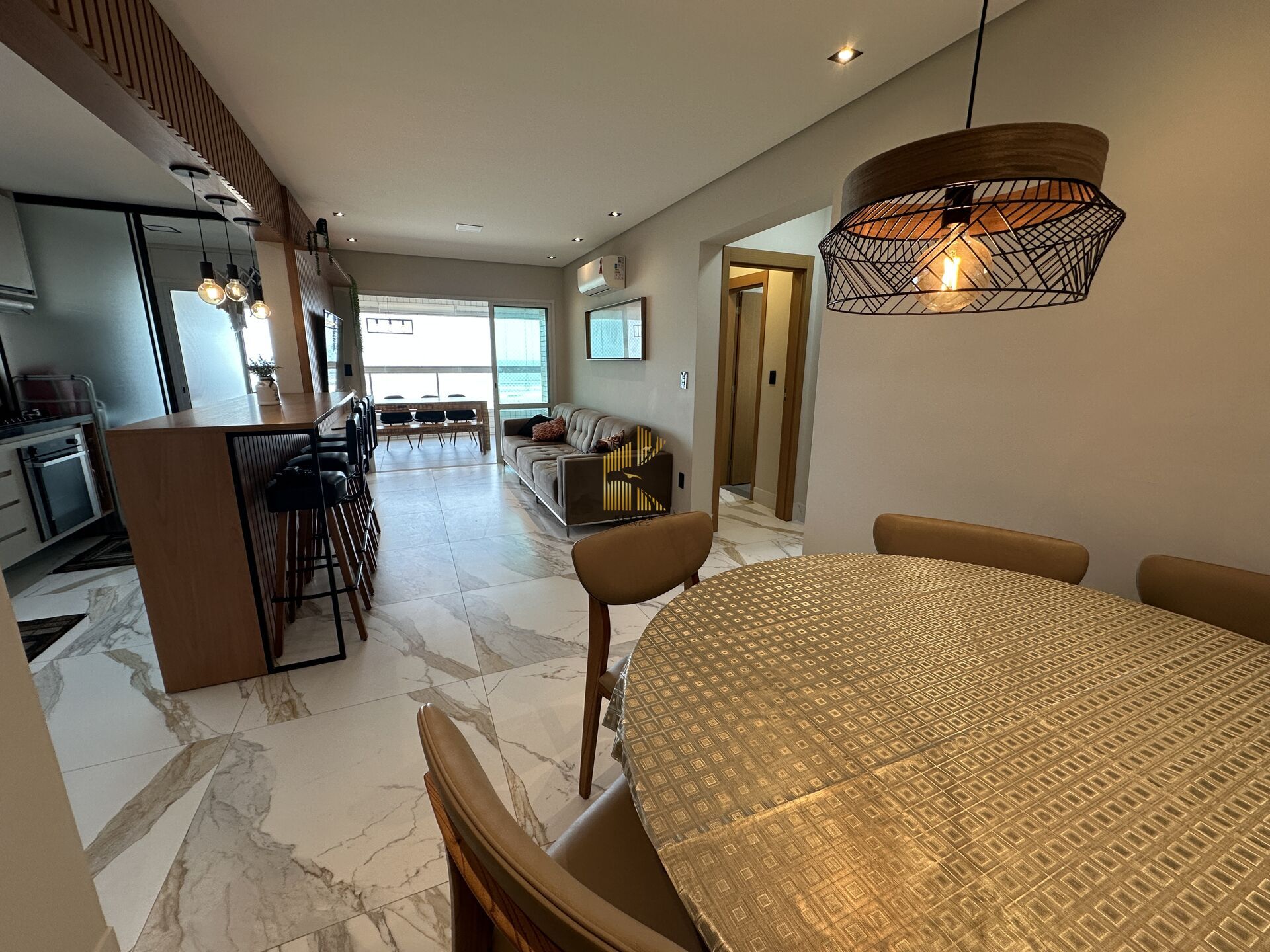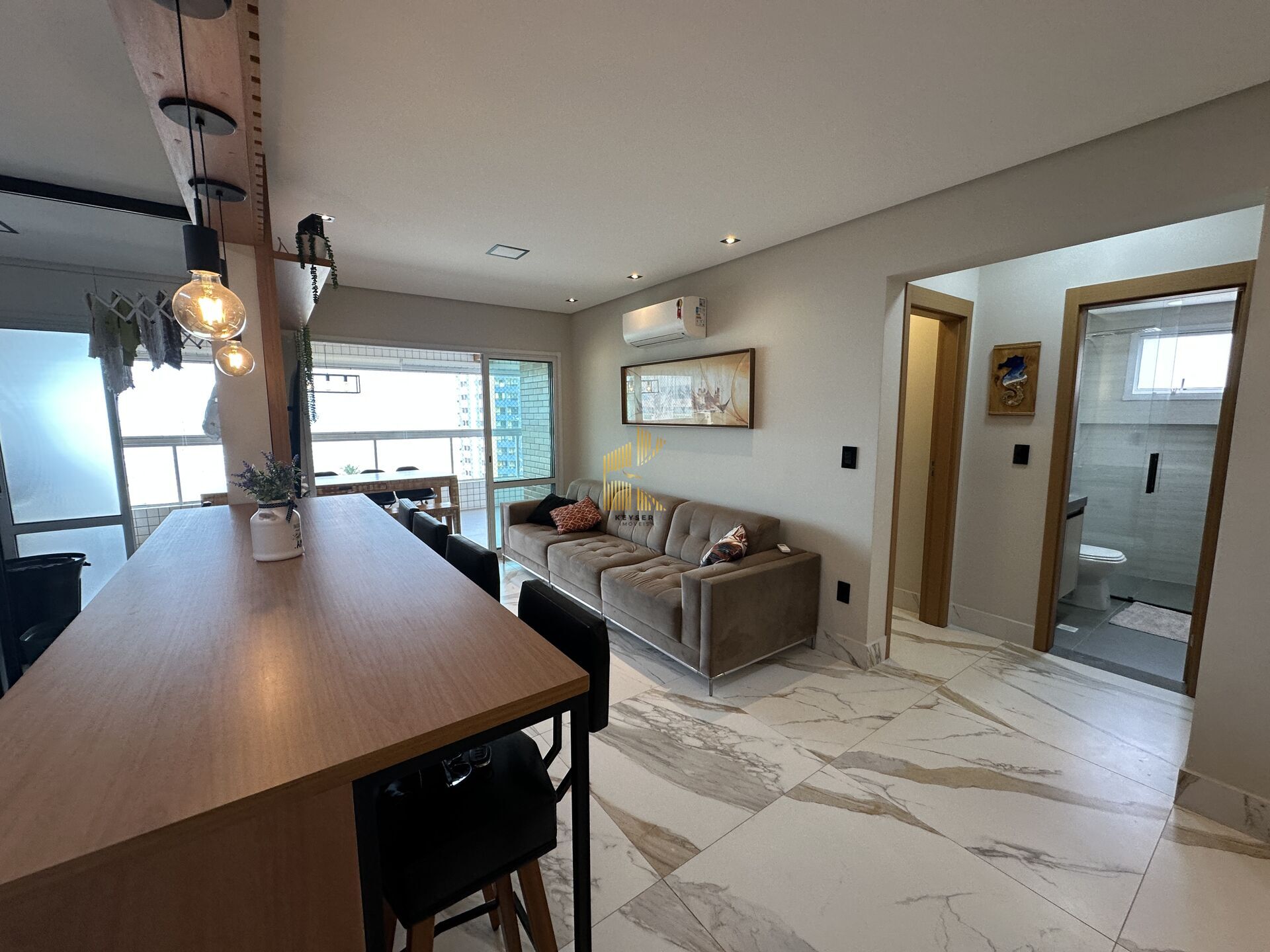 Apartamento à venda no bairro Aviação em Praia Grande, SP. 2 dormitórios sendo 1 suíte, sala dois ambientes, cozinha funcional, área de serviço, 1 banheiro social e 2 vagas de garagem demarcadas. Mobiliado porteira fechada.