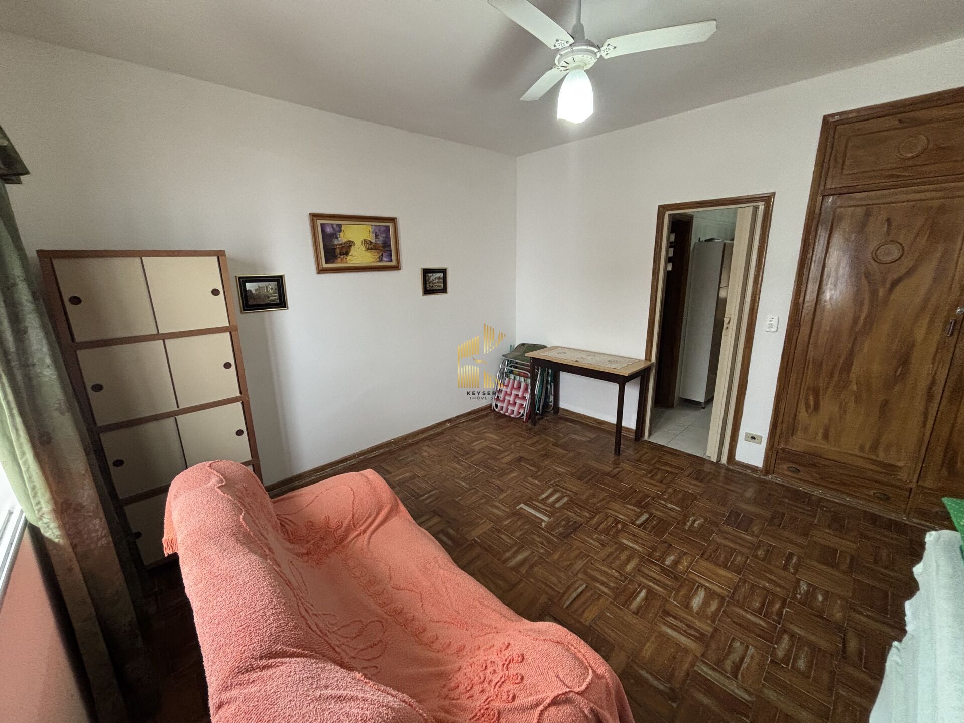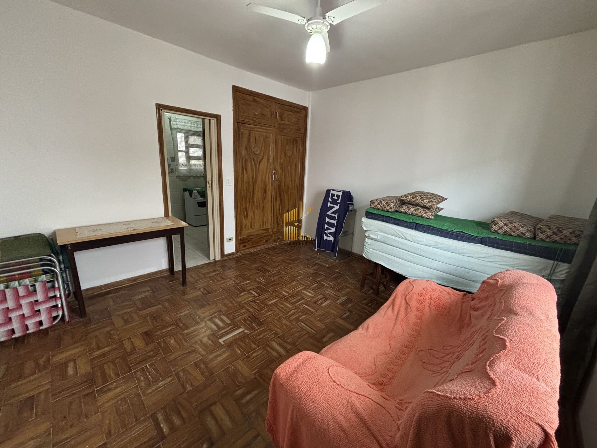 kitnet ampla, bem arejada e iluminada, com vista lateral do mar, cozinha com movéis, e banheiro social, sem vaga de garagem.