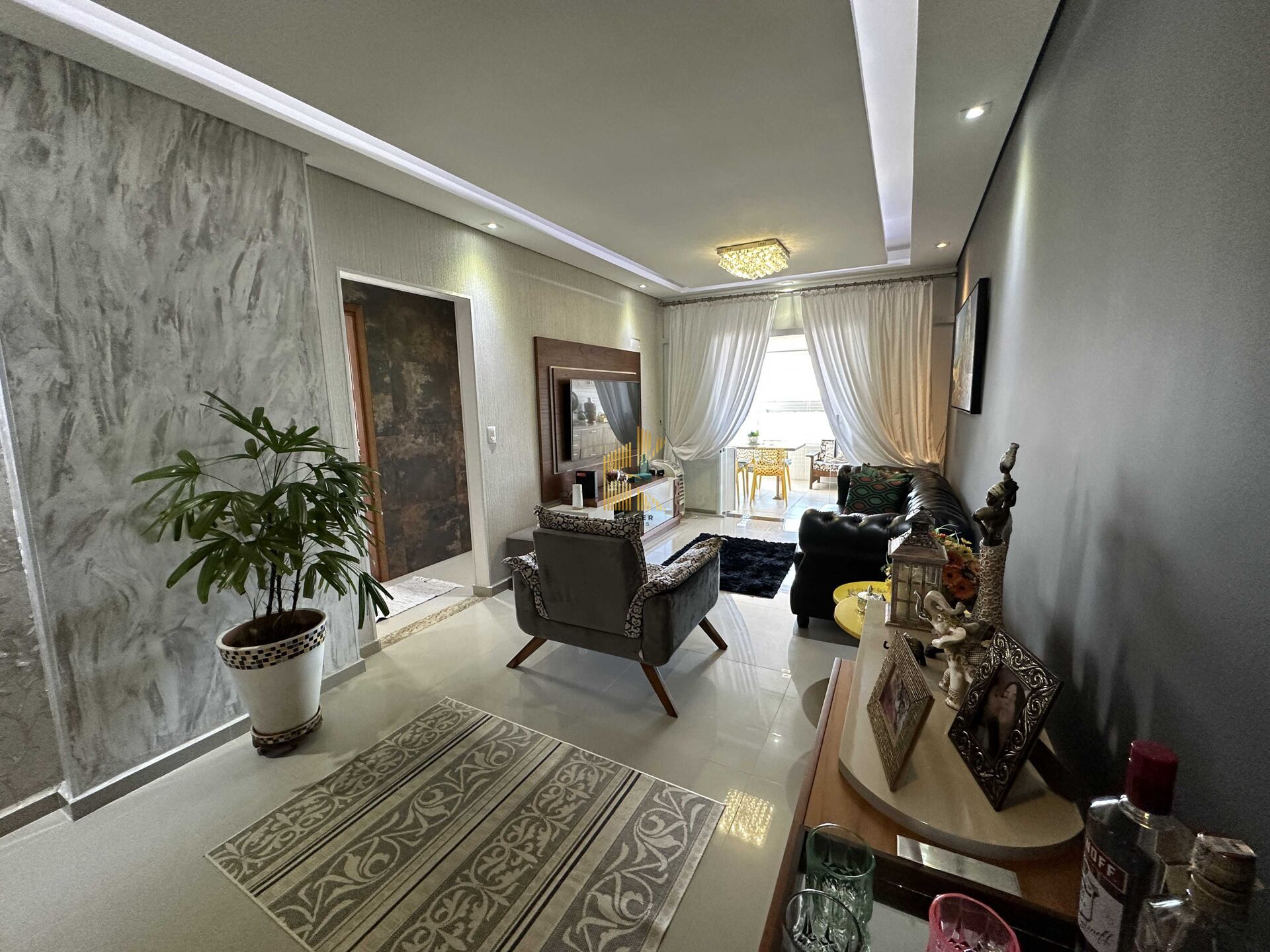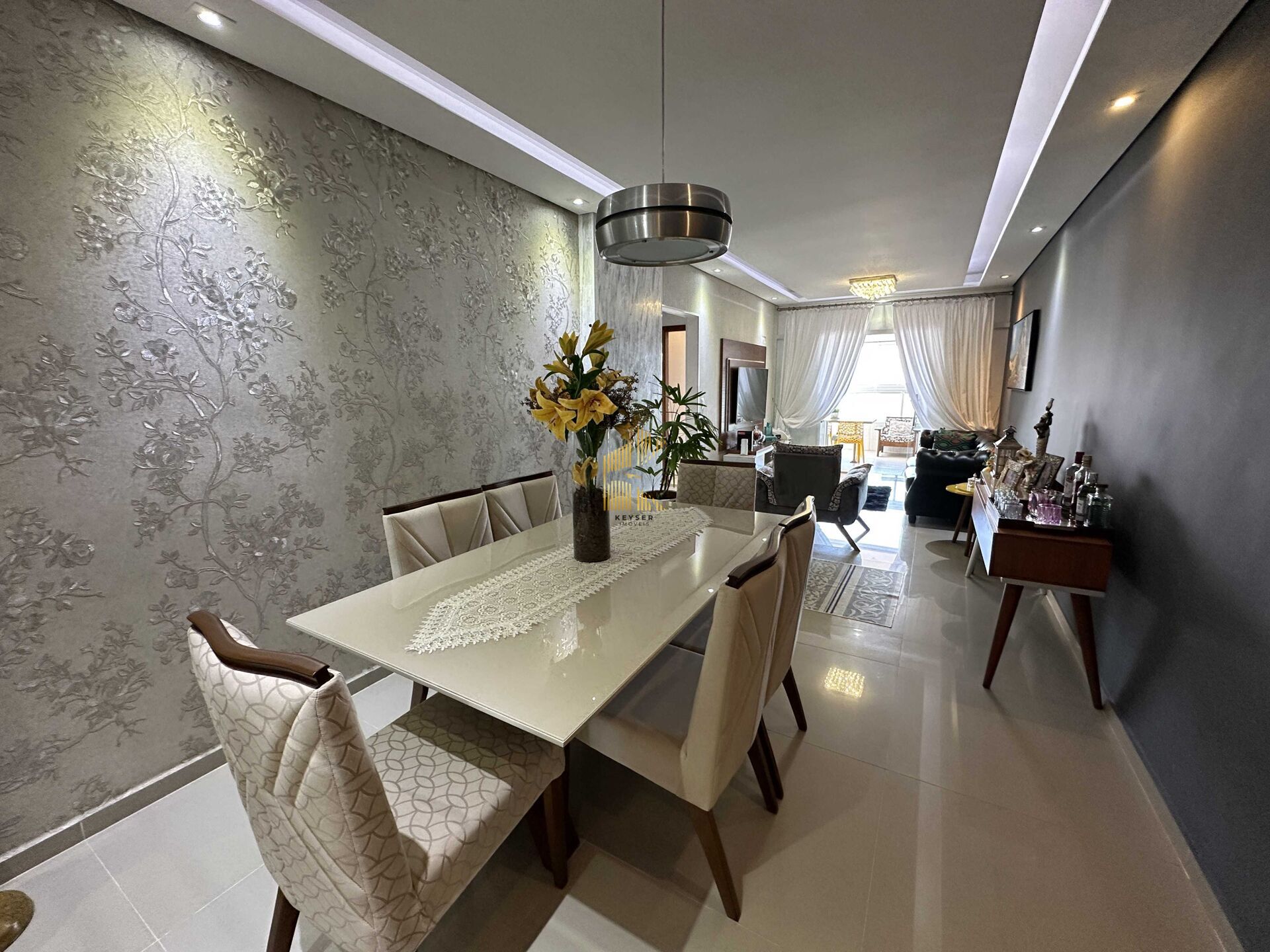Apartamento à venda no bairro Caiçara em Praia Grande, SP. 3 dormitórios sendo 3 suíte, sala dois ambientes com sacada envidraçada, cozinha planejada de alta qualidade, área de serviço, lavabo e duas vaga de garagem.