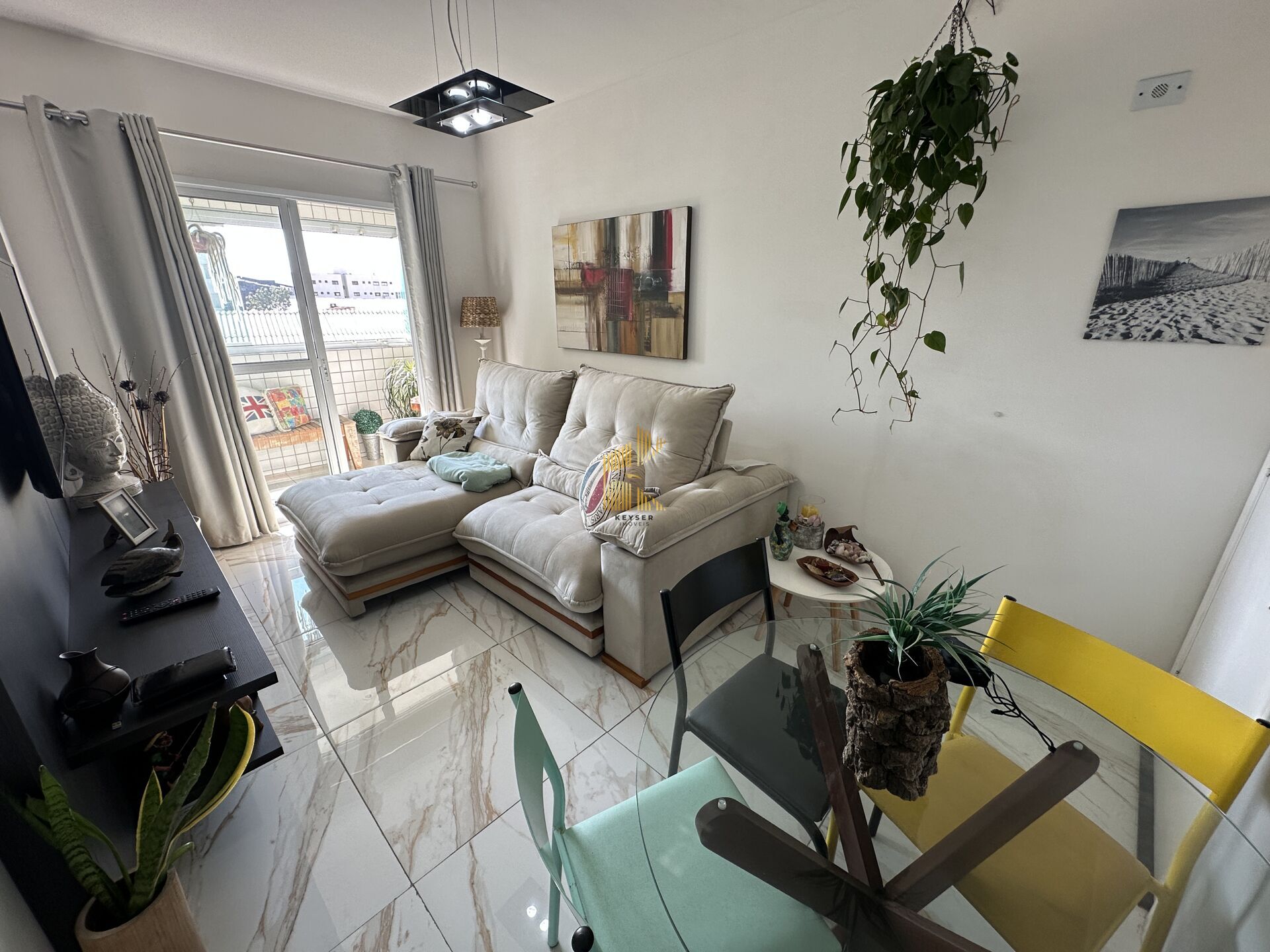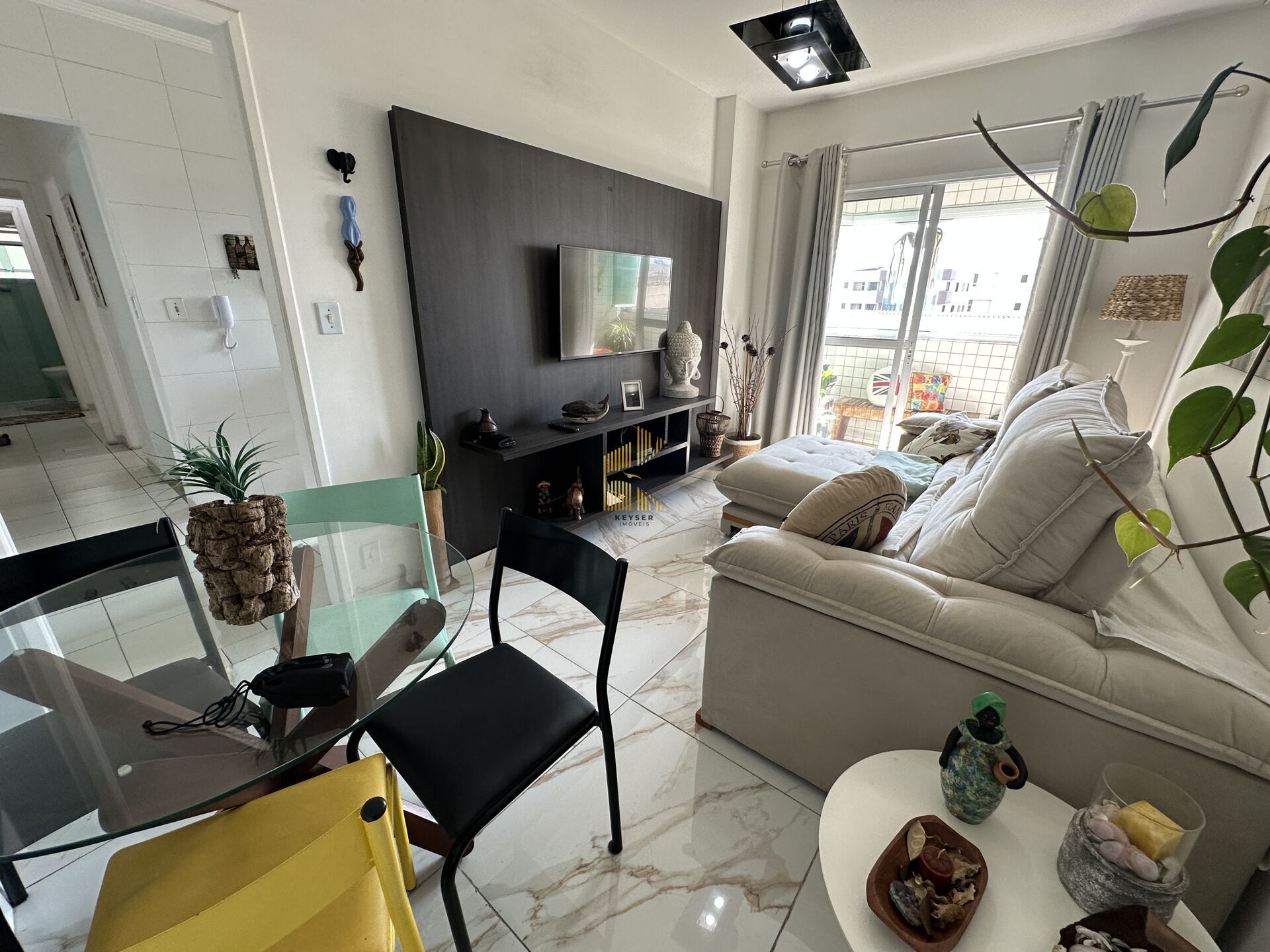 Apartamento à venda no bairro Aviação em Praia Grande, SP. 2 dormitórios, sala dois ambientes, varanda, cozinha, área de serviço, banheiro social e uma vaga de garagem. mobiliado
