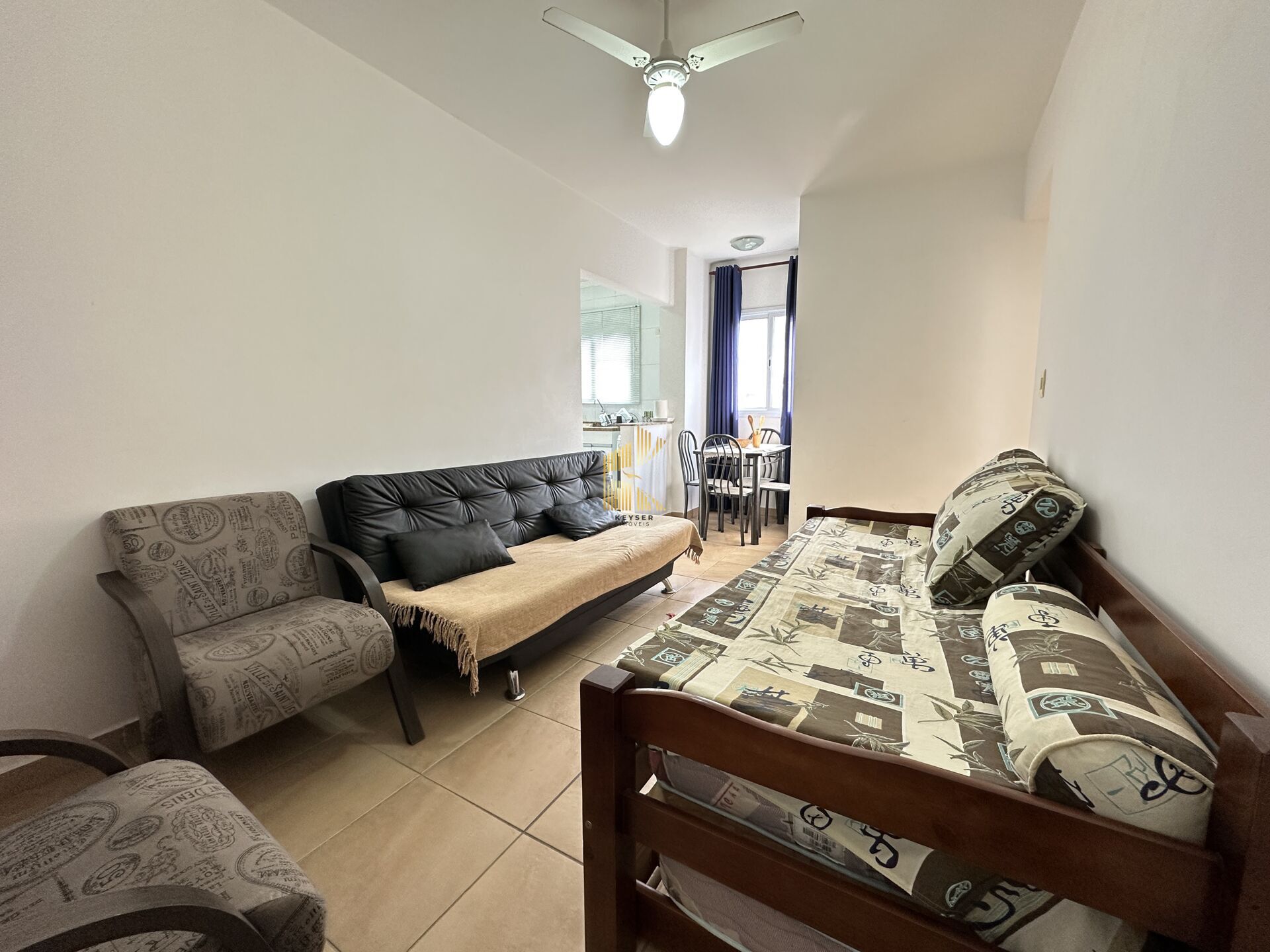 Apartamento Mobiliado à venda no bairro Tupi em Praia Grande, SP. 1 dormitório, sala, cozinha, área de serviço, banheiro social e uma vaga de garagem.