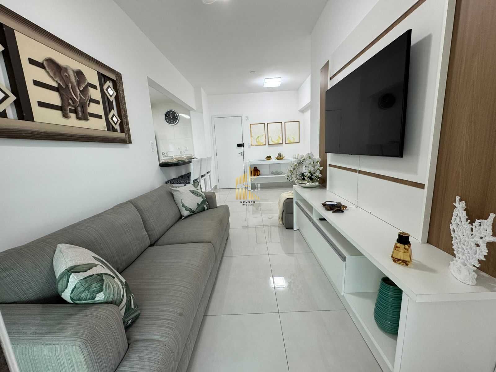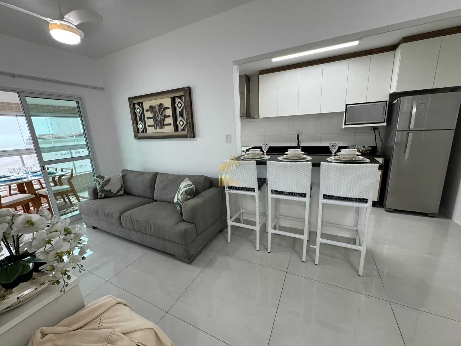 Apartamento à venda no bairro Mirim em Praia Grande, SP. 2 dormitórios sendo 1 suíte, sala dois ambientes com sacada envidraçada, cozinha planejada, área de serviço, banheiro social e uma vaga de garagem. mobiliado
