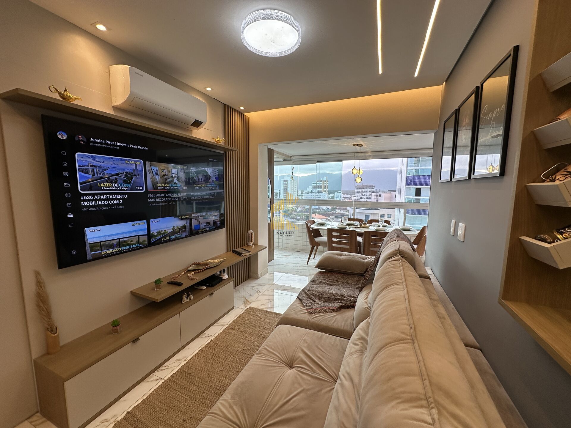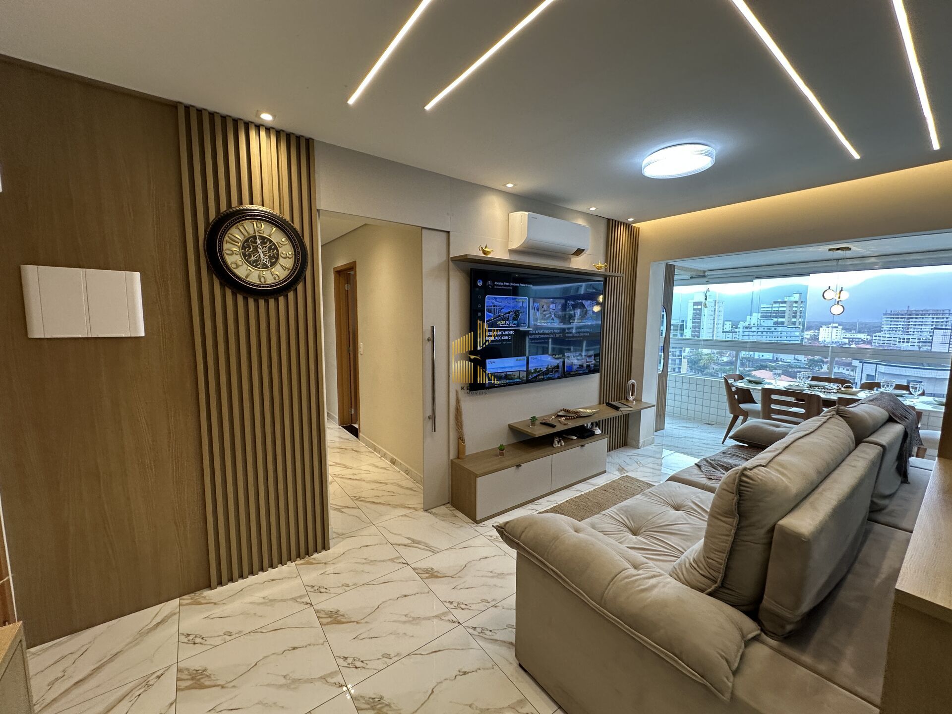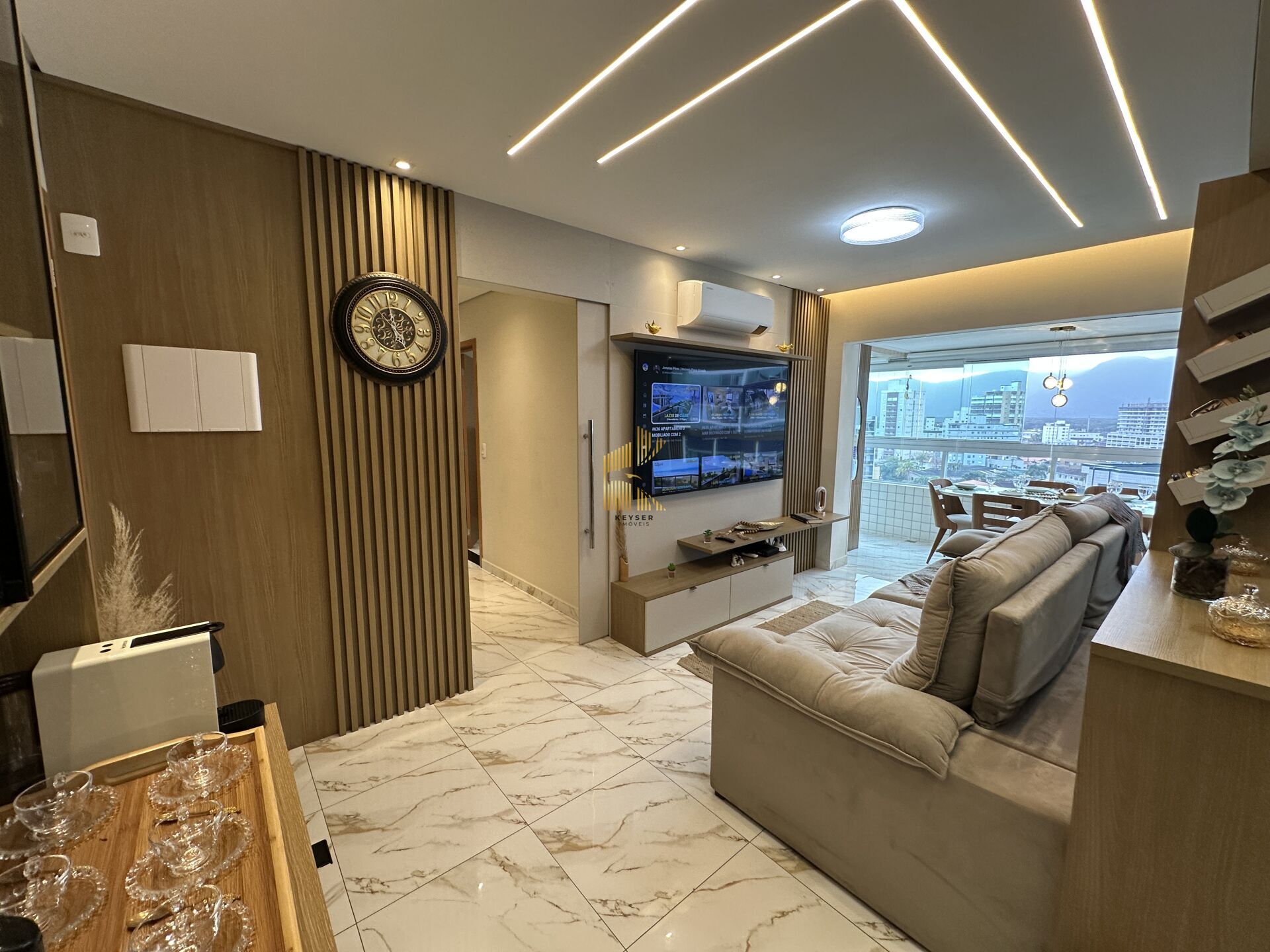 Apartamento à venda no bairro Caiçara em Praia Grande, SP. 2 dormitórios sendo 1 suíte, sala dois ambientes com sacada envidraçada, cozinha planejada, área de serviço, banheiro social e uma vaga de garagem. mobiliado