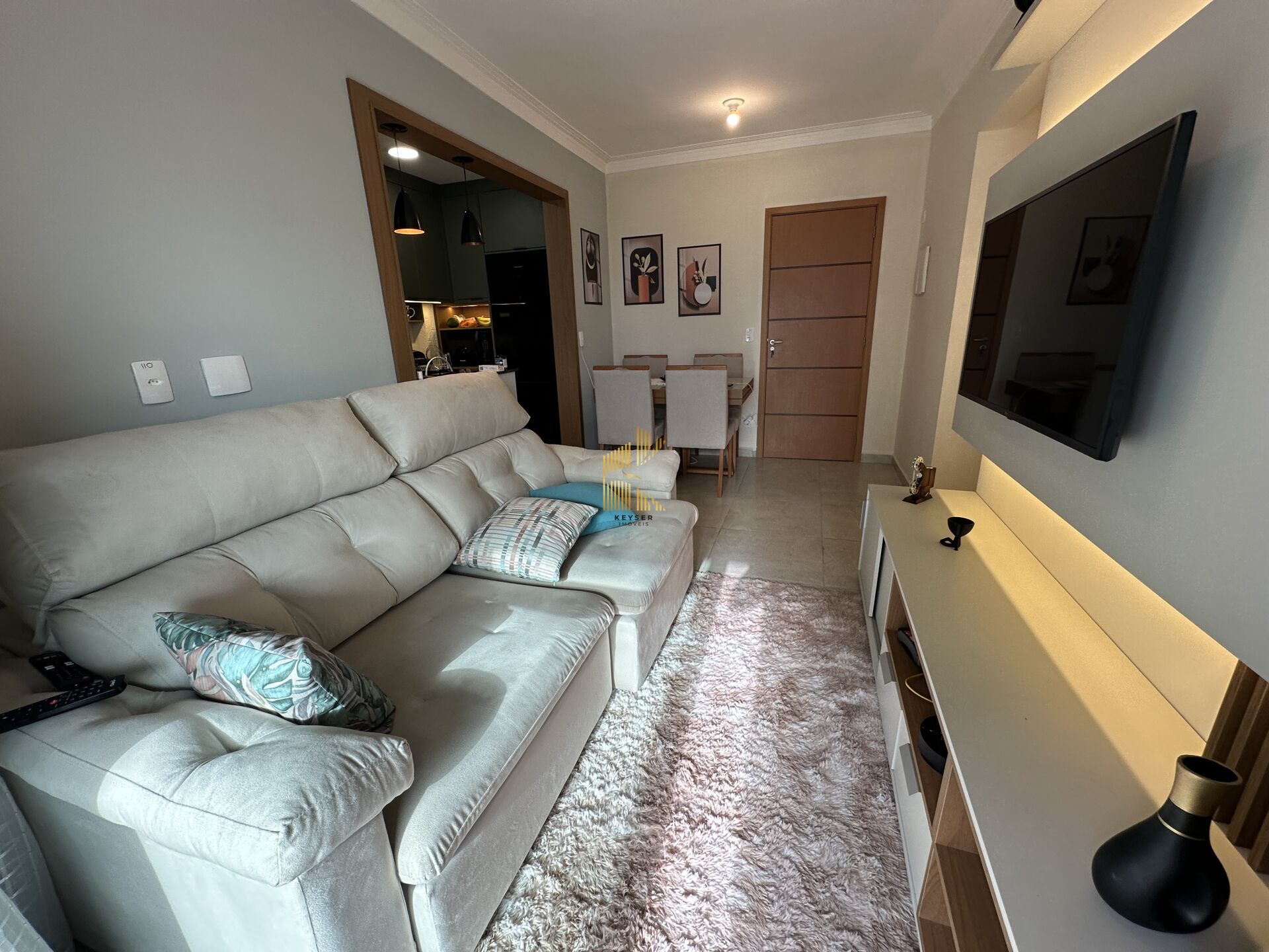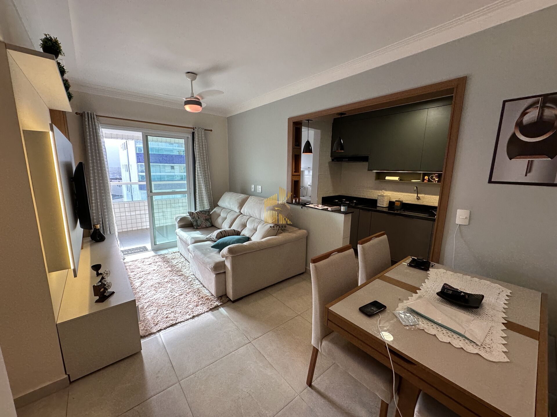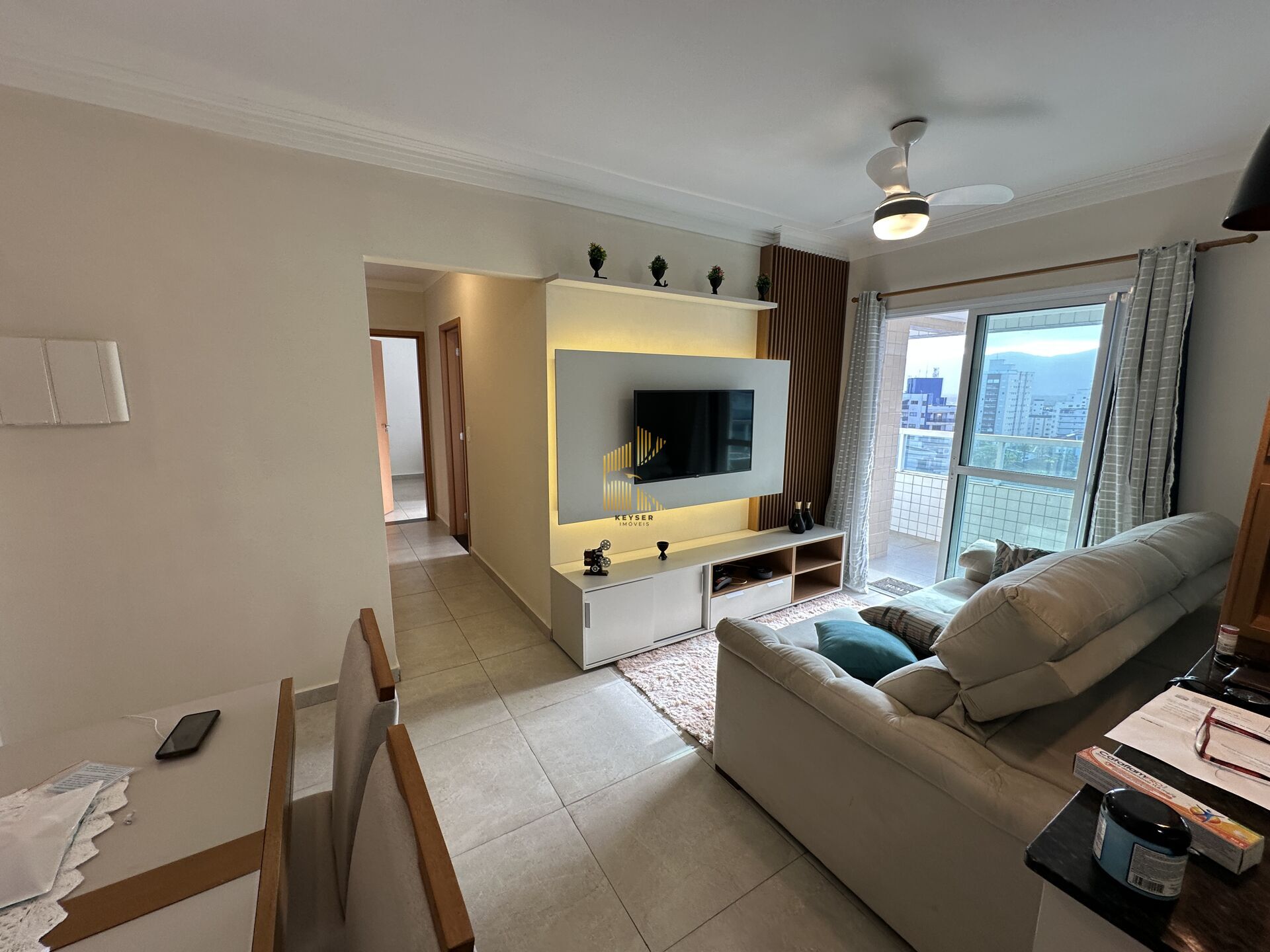Apartamento à venda no bairro Caiçara em Praia Grande, SP. 2 dormitórios sendo 1 suíte, sala dois ambientes com sacada envidraçada, cozinha planejada, área de serviço, banheiro social e uma vaga de garagem. mobiliado