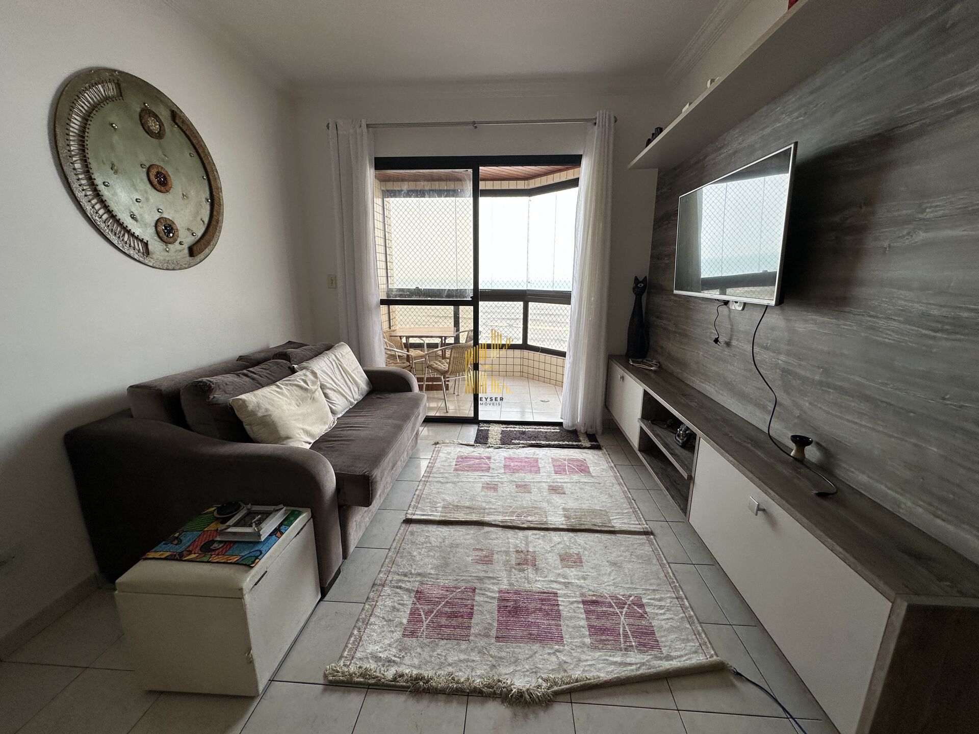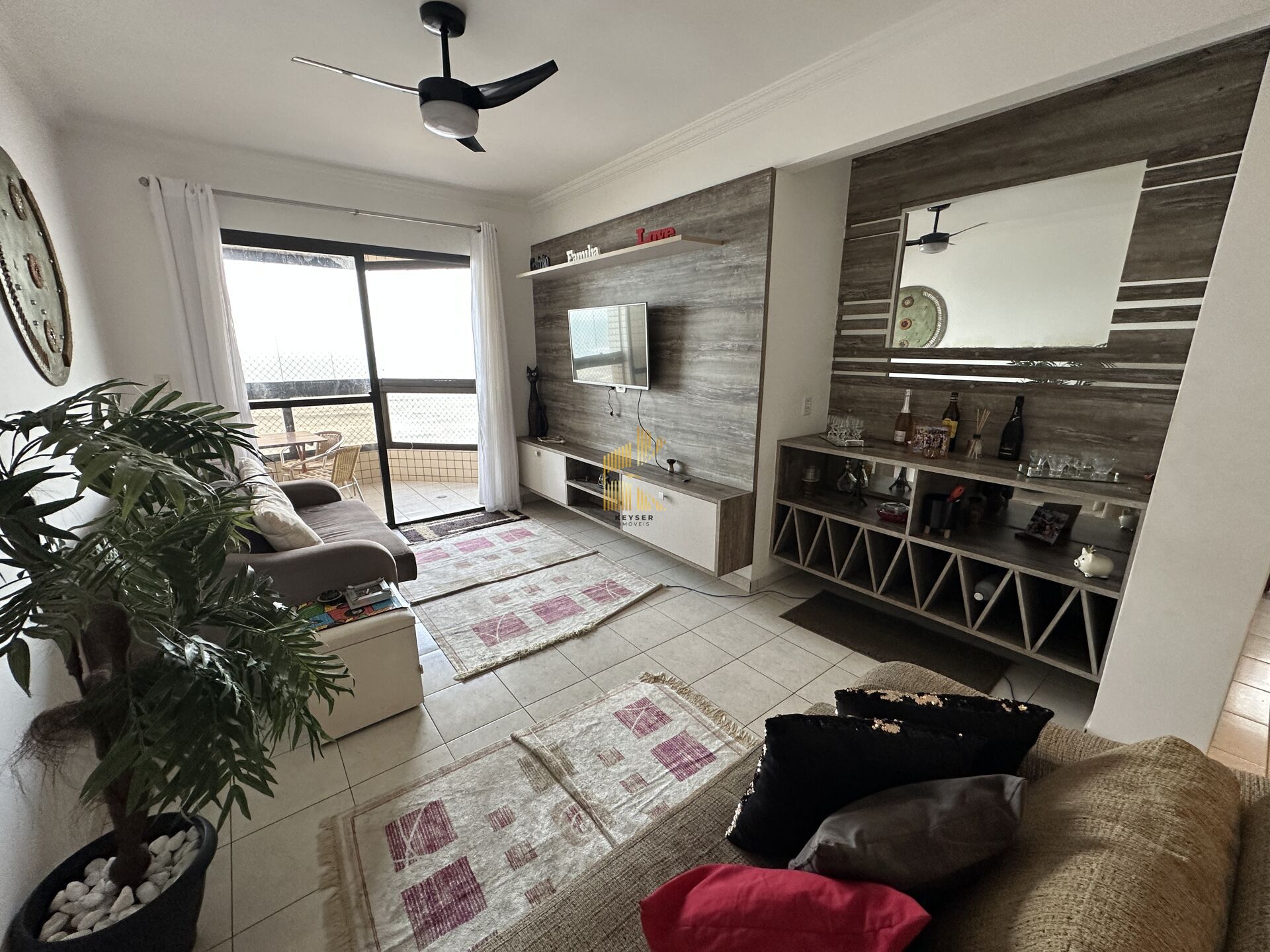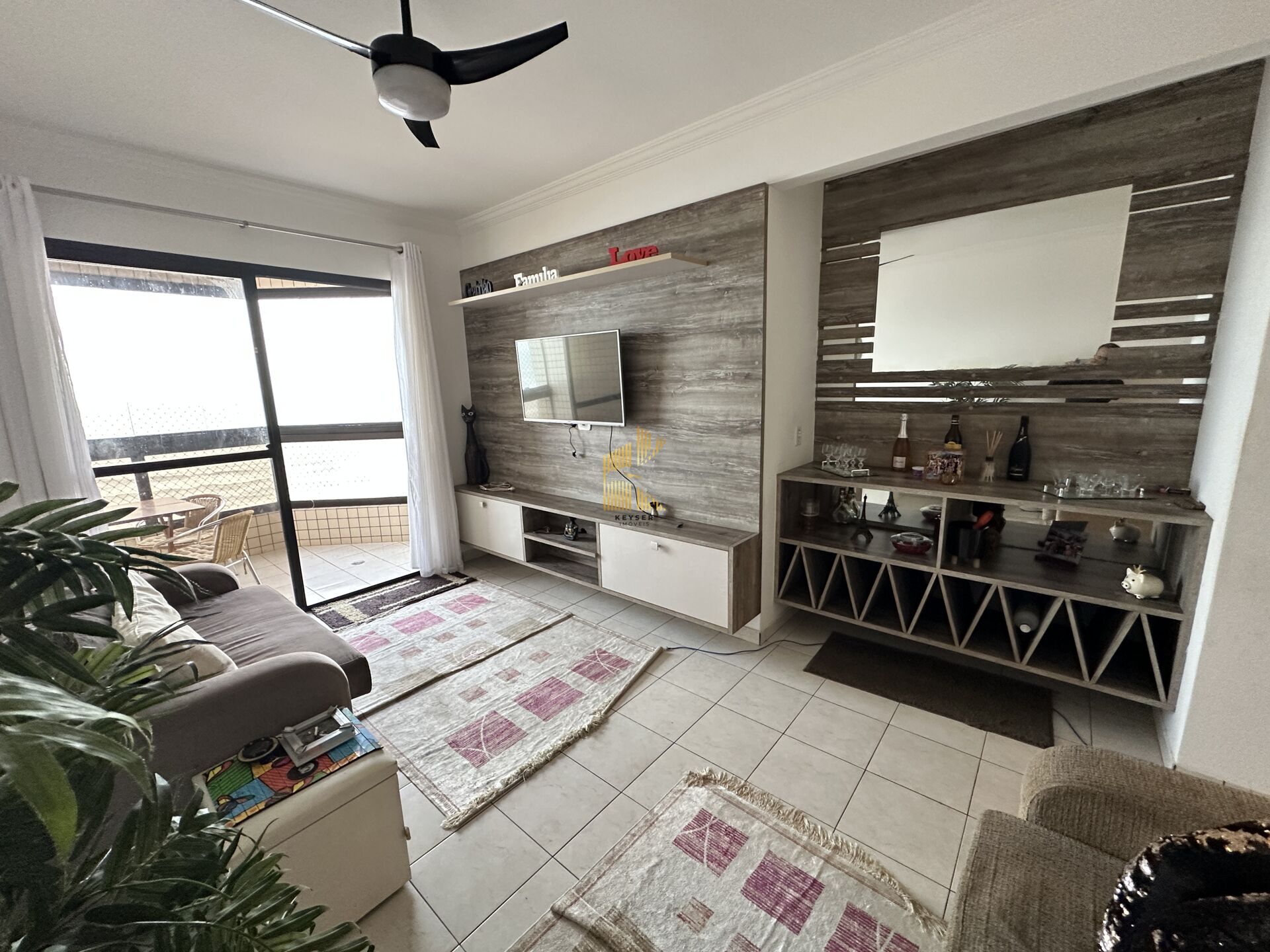 Apartamento à venda no bairro Caiçara em Praia Grande, SP. 2 dormitórios sendo 1 suíte, sala dois ambientes com sacada envidraçada, cozinha planejada, área de serviço, banheiro social e uma vaga de garagem.