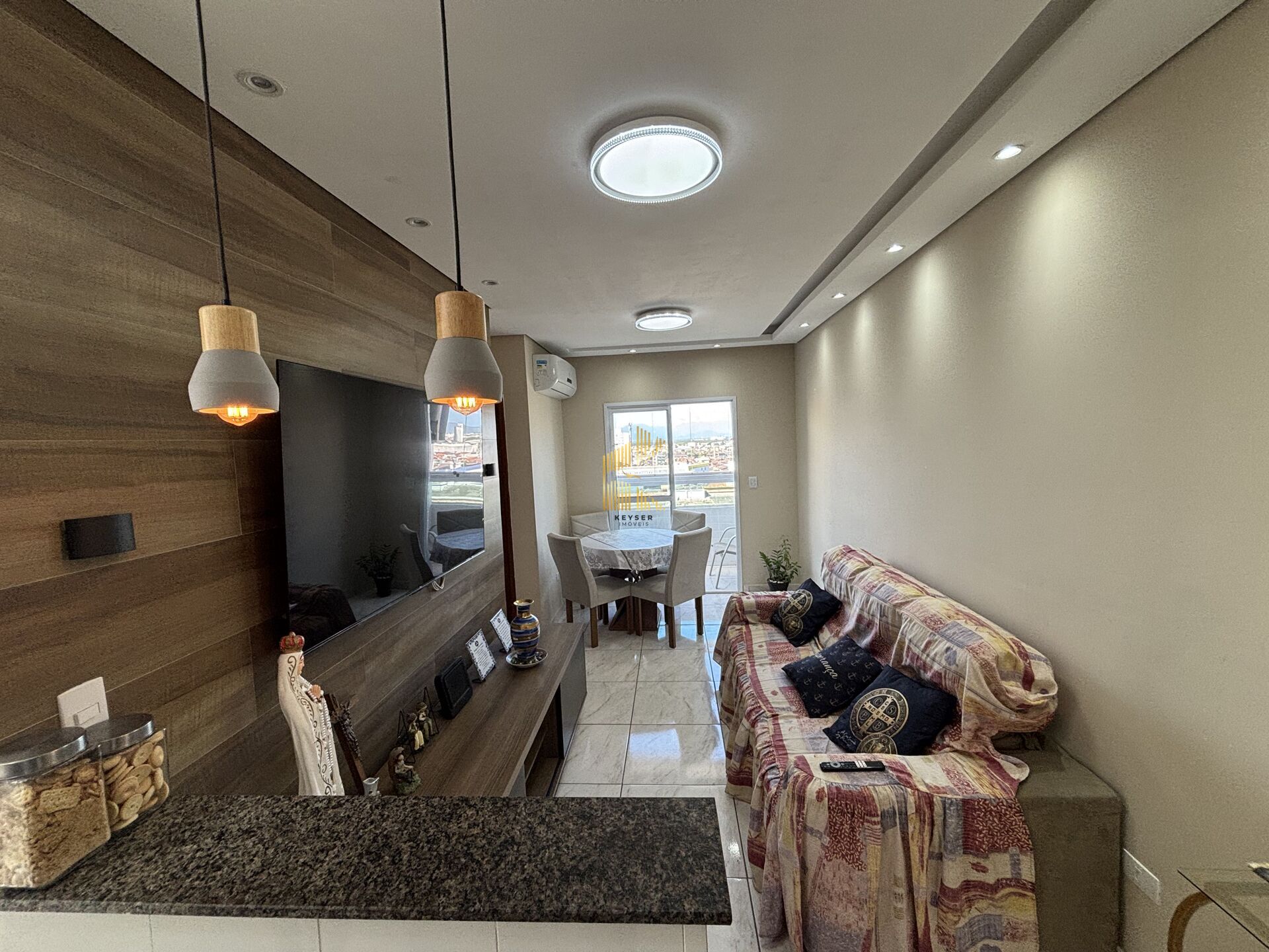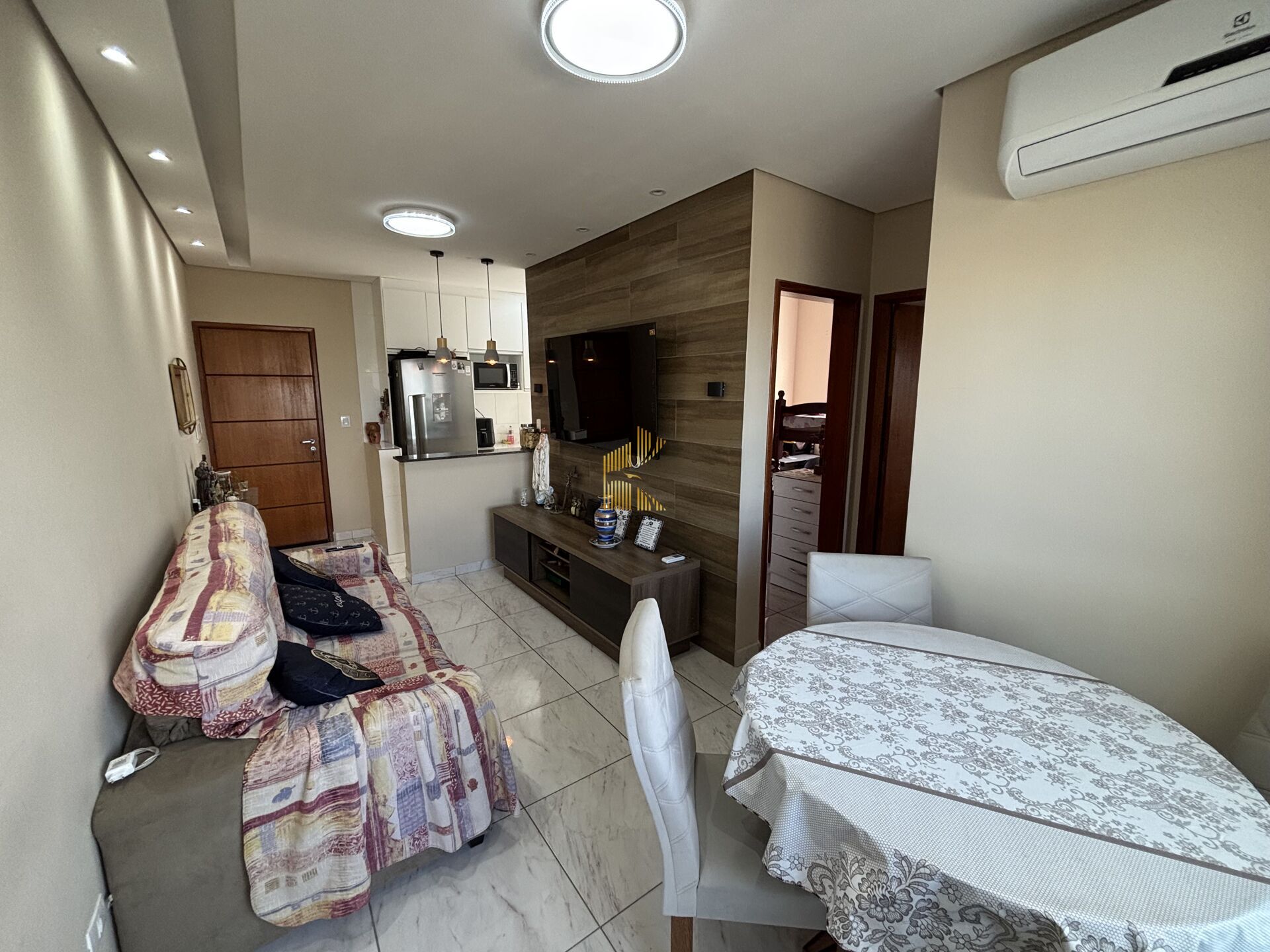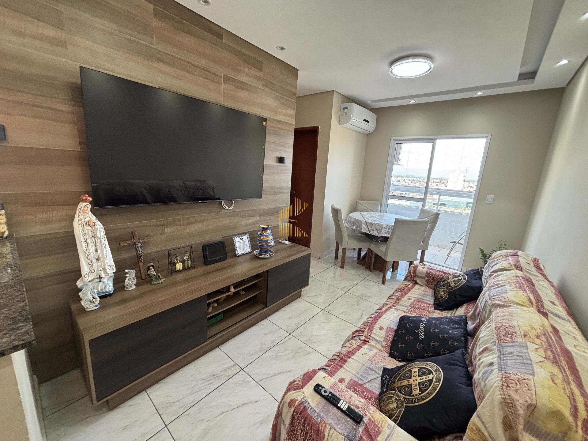 Apartamento à venda no bairro Ocian em Praia Grande, SP. 2 dormitórios, sala dois ambientes com sacada envidraçada e vista livre, cozinha planejada, área de serviço, banheiro social e uma vaga de garagem.