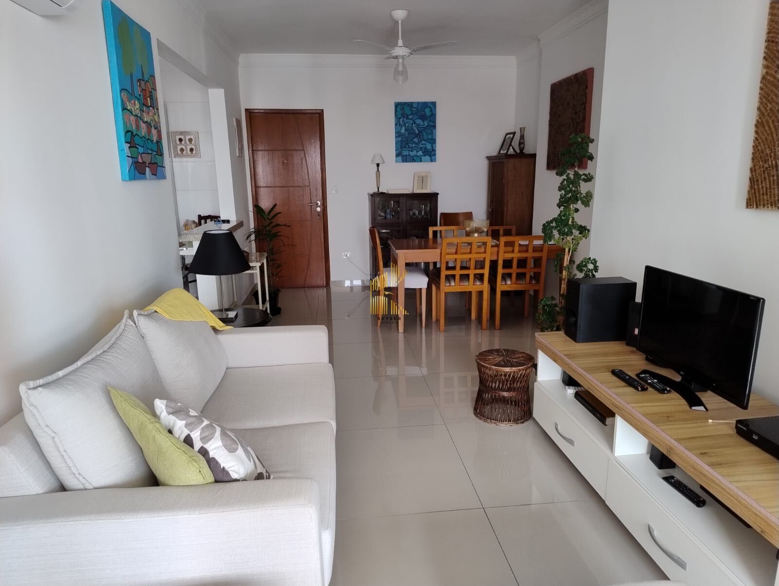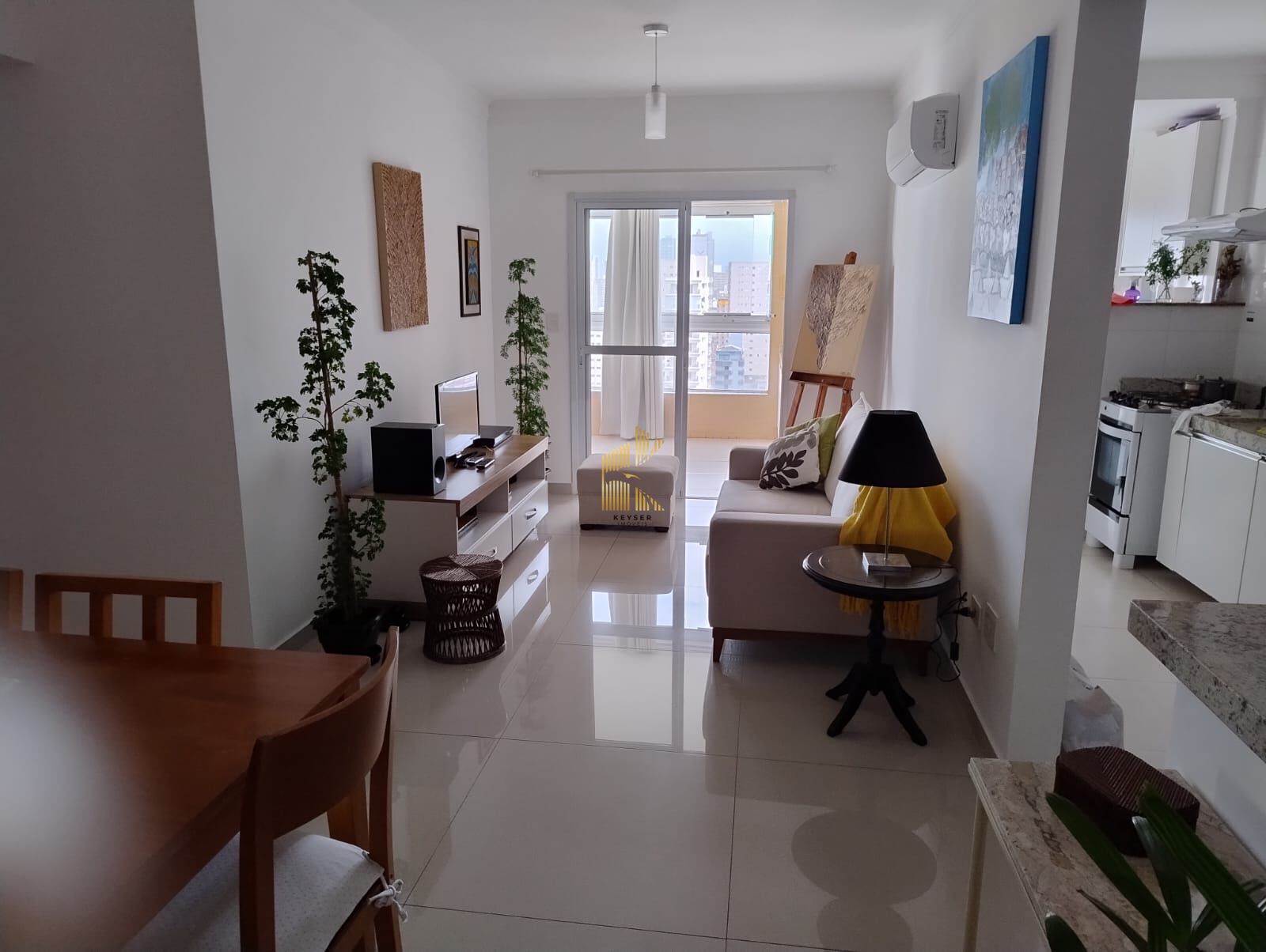 Apartamento à venda no bairro Canto do Forte em Praia Grande, SP. 3 dormitórios (2 suíte), sala, cozinha planejada, área de serviço, banheiro social e duas vagas de garagem demarcadas.