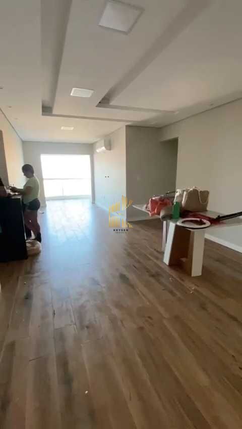 Apartamento à venda no bairro Caiçara em Praia Grande, SP. 2 dormitórios sendo 2 suítes, sala dois ambientes com sacada envidraçada, cozinha planejada, área de serviço, banheiro social e duas vagas de garagem.