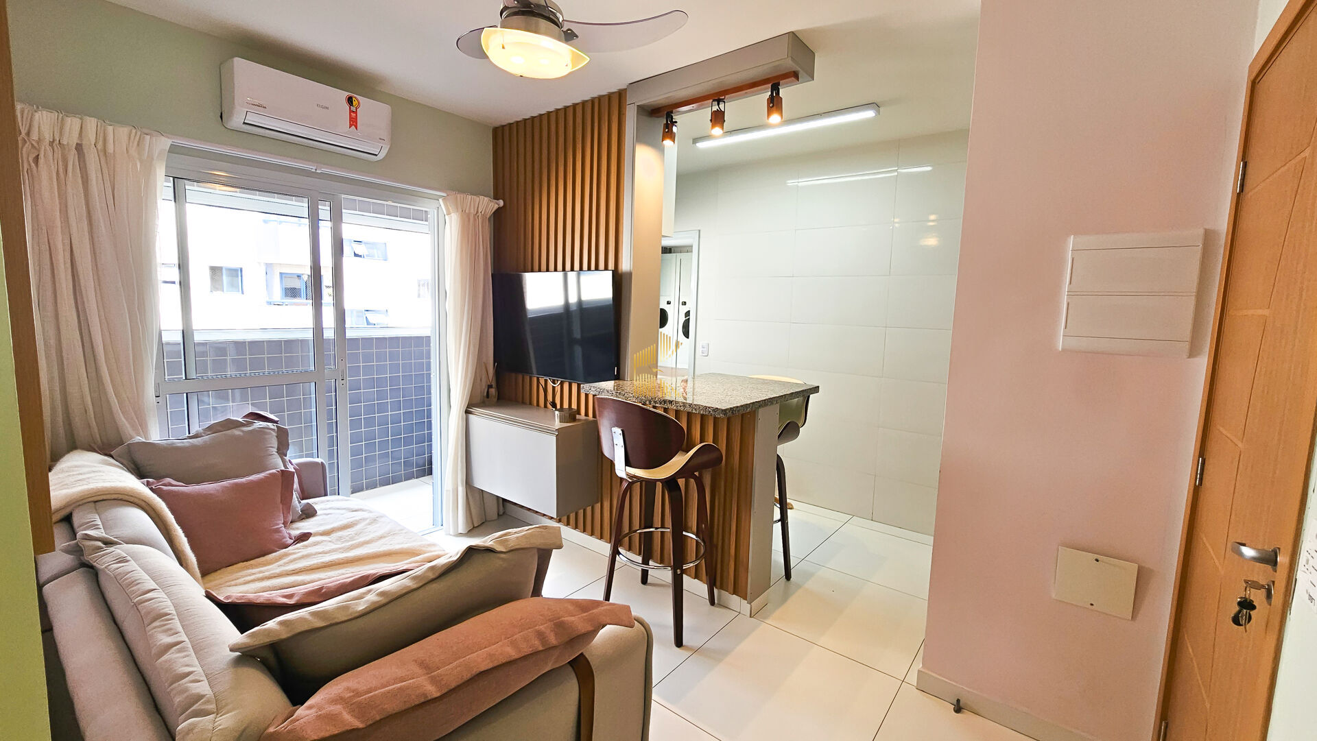 Apartamento à venda no bairro Canto do Forte em Praia Grande, SP. 1 dormitório, sala dois ambientes com sacada envidraçada, cozinha planejada, área de serviço, banheiro social e uma vaga de garagem. Será vendido mobiliado.