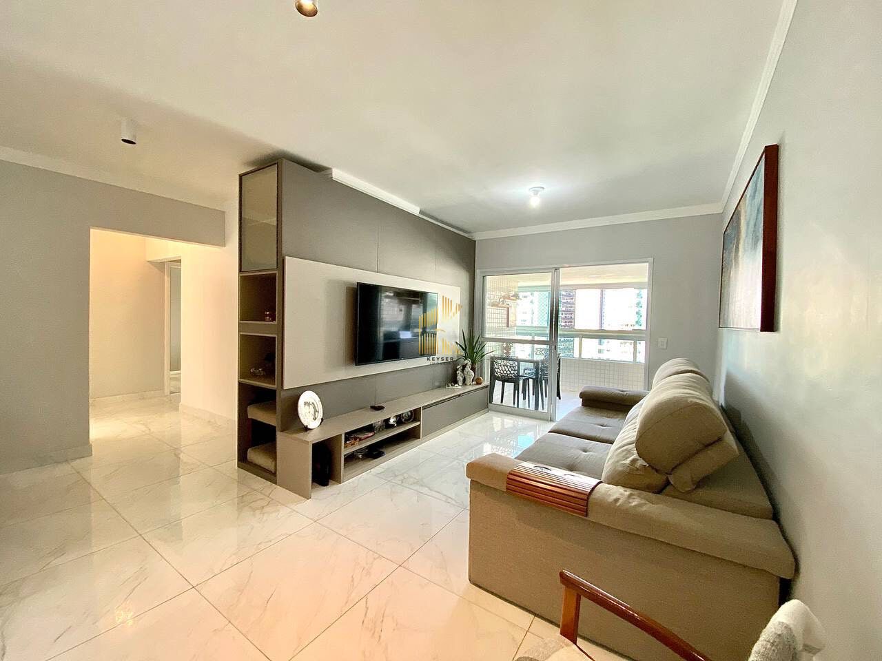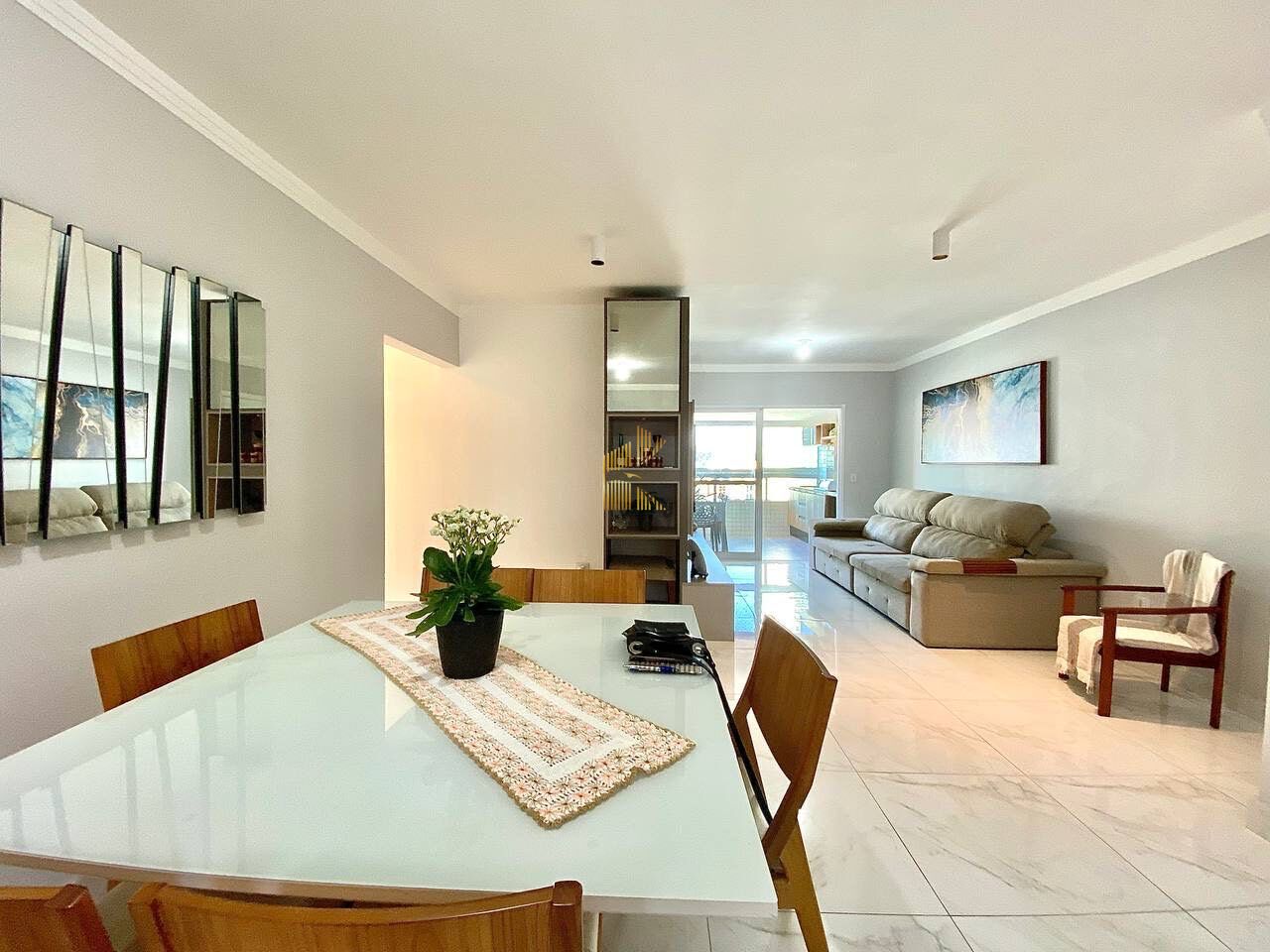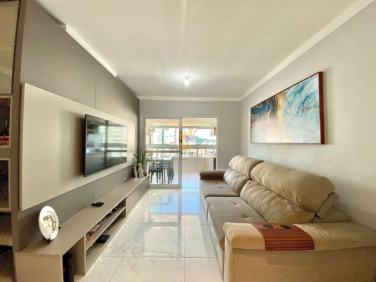 Apartamento à venda no bairro Guilhermina em Praia Grande, SP. 3 dormitórios sendo 3 suítes, sala dois ambientes com varanda gourmet e sacada envidraçada, cozinha, dependência da empregada com banheiro, área de serviço, lavabo e duas vagas de garagem. Fica mobiliado.