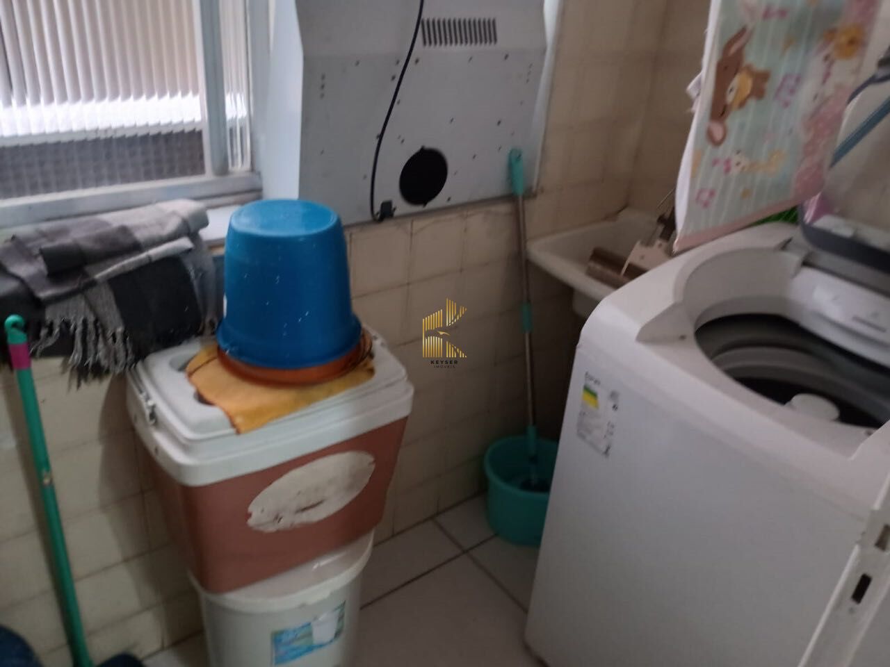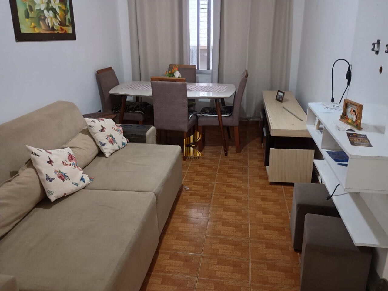 Apartamento à venda no bairro Tupi em Praia Grande, SP. 2 dormitórios, sala dois ambientes, cozinha, área de serviço, banheiro social e uma vaga de garagem.