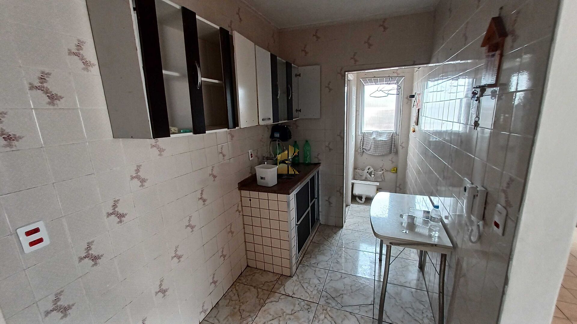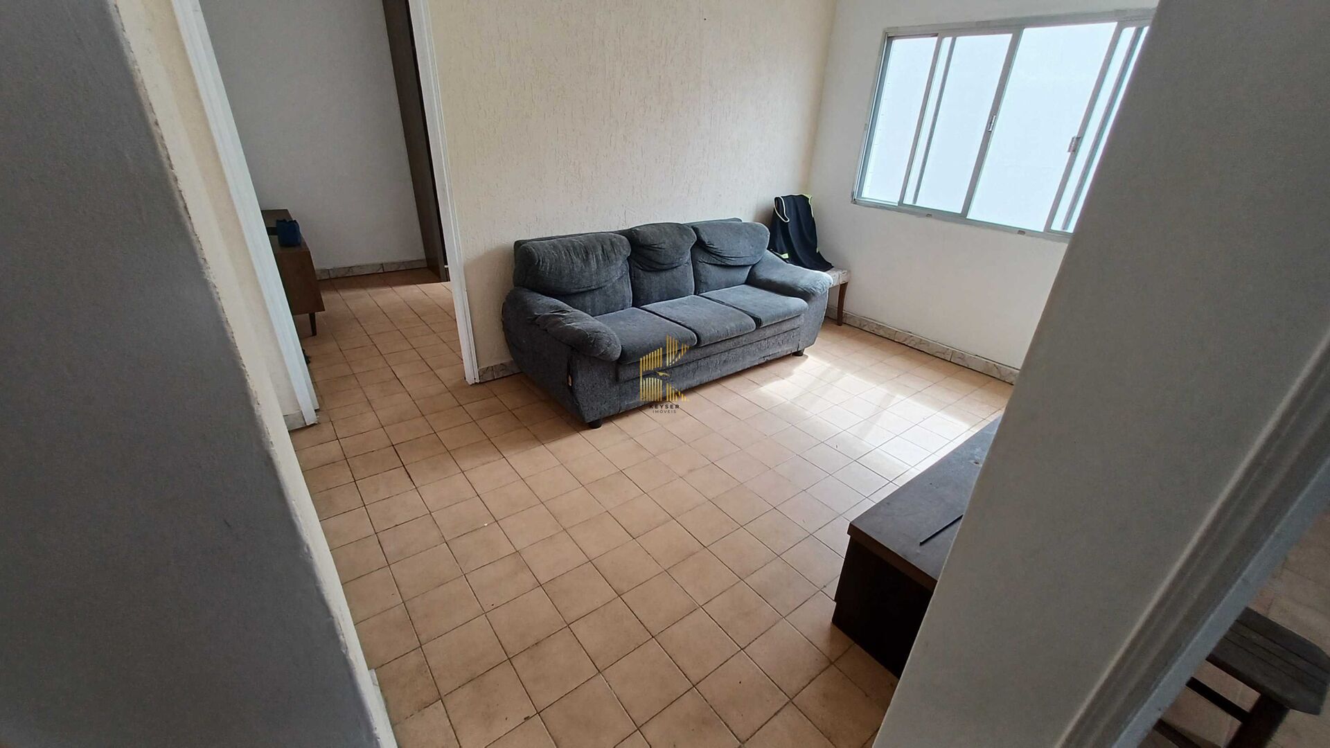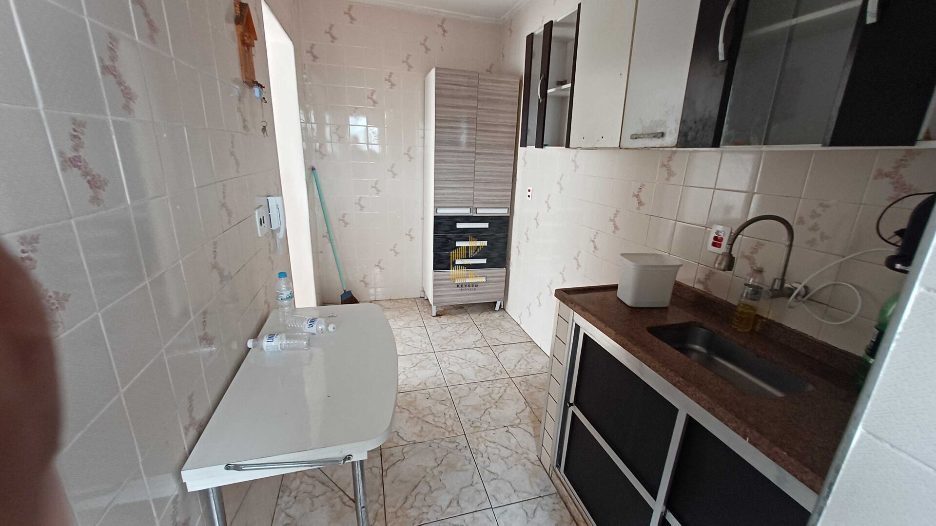 Apartamento à venda no bairro Caiçara em Praia Grande, SP. 2 dormitórios, sala, cozinha, área de serviço, banheiro social, banheiro de serviço e uma vaga de garagem.