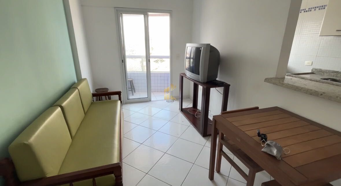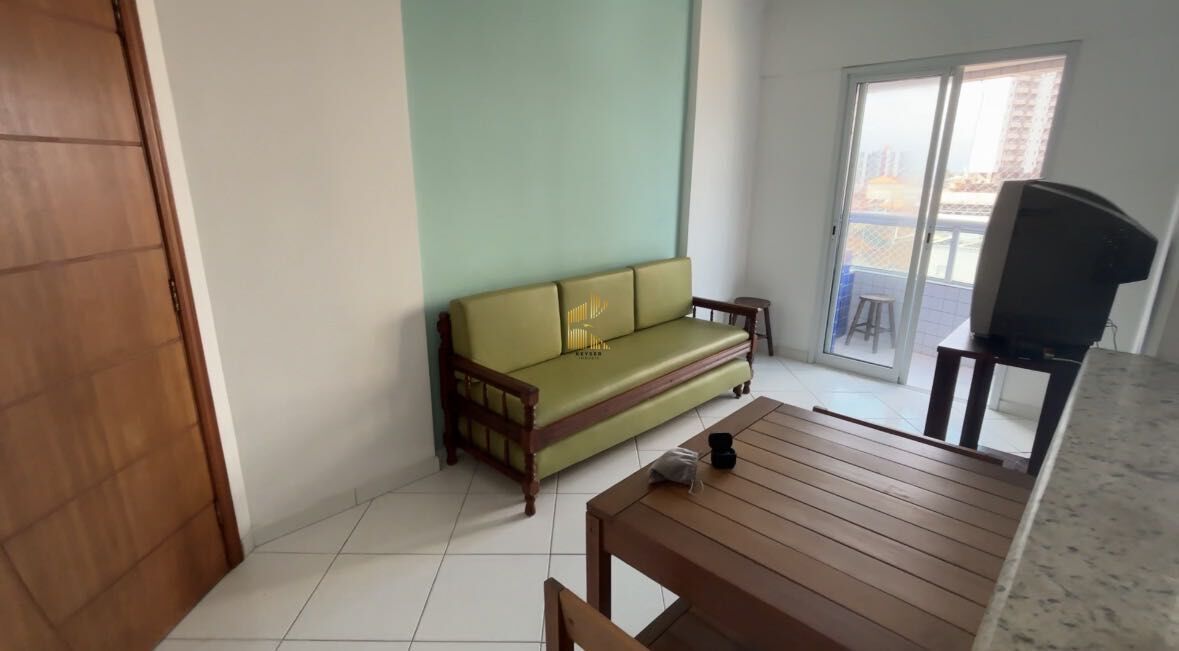 Apartamento à venda no bairro Caiçara em Praia Grande, SP. 1 dormitório, sala com sacada, cozinha, área de serviço, banheiro social e uma vaga de garagem.