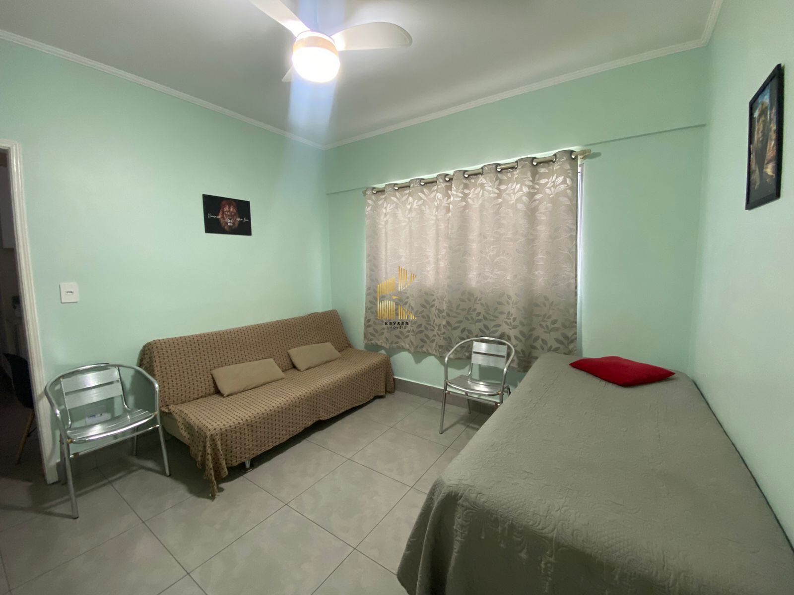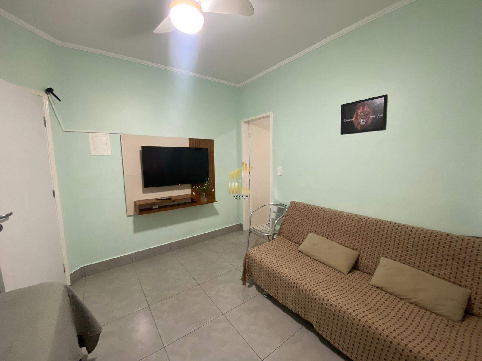 Apartamento à venda no bairro Canto do Forte em Praia Grande, SP. 1 dormitório, sala, cozinha com armário, área de serviço, banheiro social e uma vaga de garagem. Fica Mobiliado