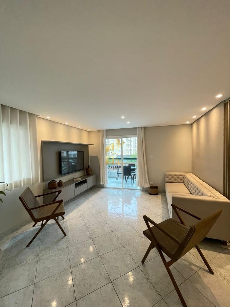 Apartamento à venda no bairro Tupi em Praia Grande, SP. 3 dormitórios (1 suíte master com varanda privativa), sala espaçosa com 3 ambientes, varanda gourmet, cozinha ampla com entrada individual, banheiro social, área de serviço e 1 vaga de garagem. O imóvel será vendido mobiliado.