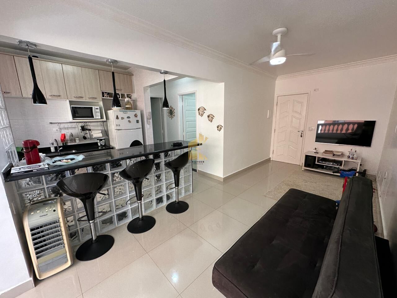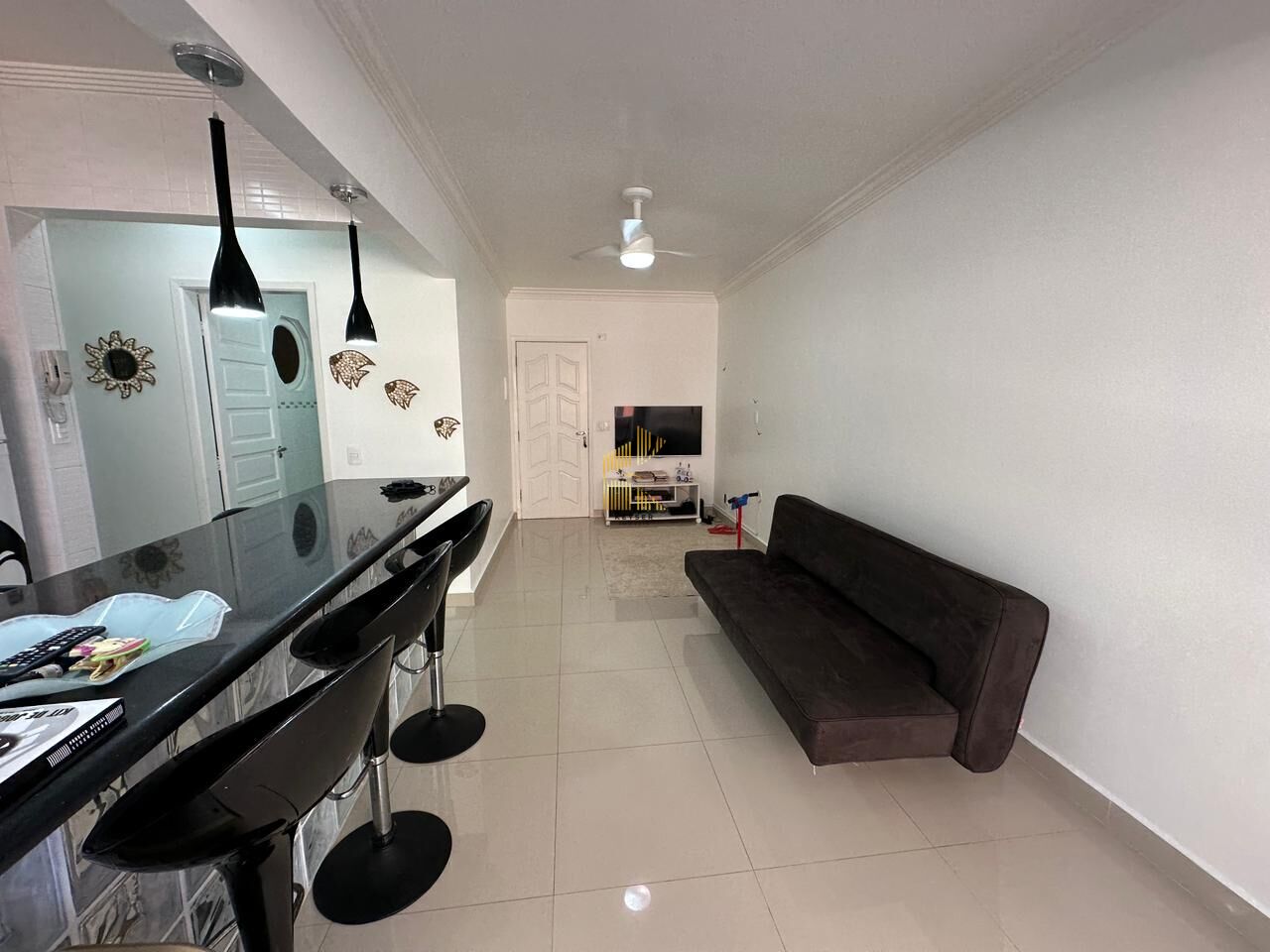 Apartamento para locação anual no bairro Aviação em Praia Grande, SP. 1 dormitório grande, sala integrada com sacada envidraçada, cozinha com planejados, área de serviço, banheiro social, 1 vaga.