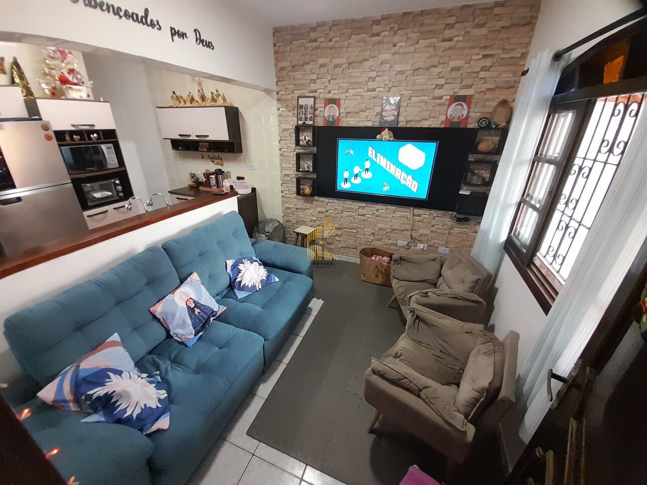 Casa geminada à venda no bairro Caiçara em Praia Grande, SP. 2 dormitórios (sendo 1 suíte), sala dois ambientes, cozinha, área de serviço, banheiro social, quintal e duas vagas de garagem.