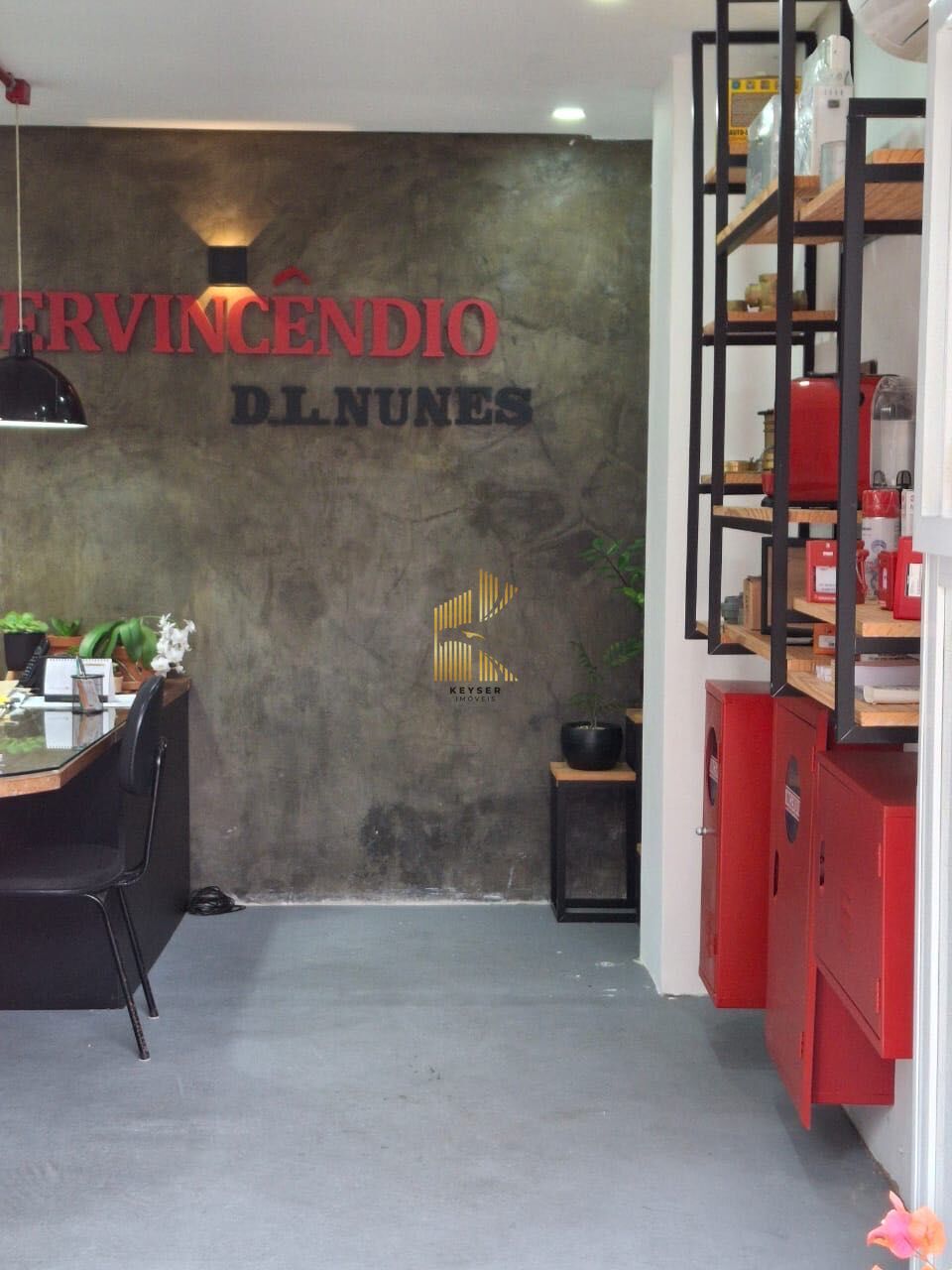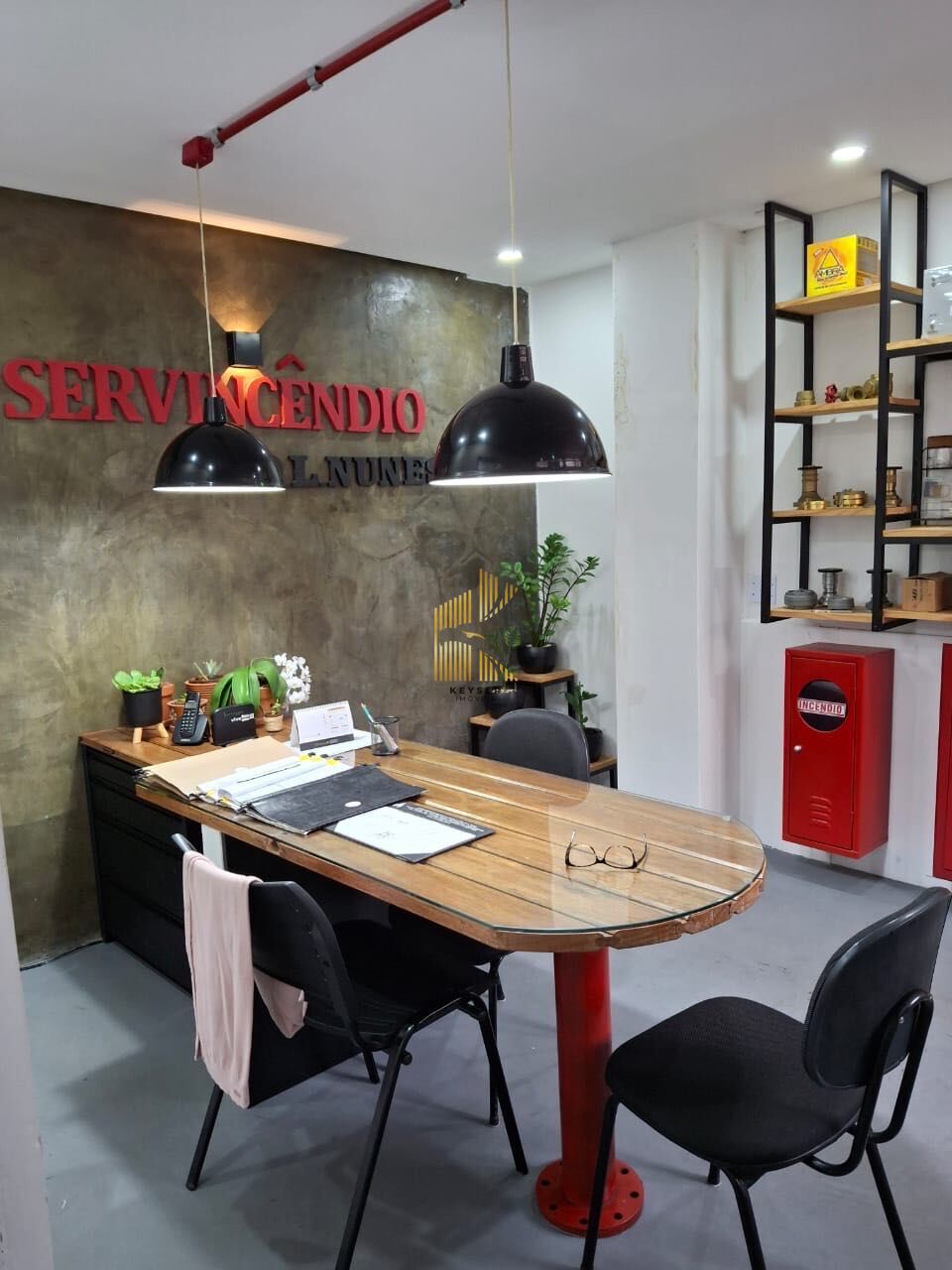 Loja à venda no bairro Guilhermina em Praia Grande, SP. Espaço para escritório, cozinha planejada, área de serviço, banheiro social e uma vaga de garagem coberta e uma vaga na frente da loja para carro pequeno.